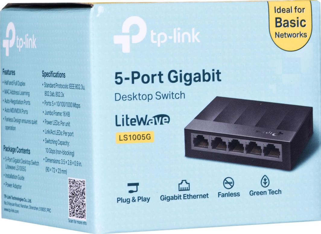 Switch të serive litewave TP-Link janë një mënyrë e thjeshtë dhe me kosto efektive për të zgjeruar rrjetin tuaj me tela. Pajisjet nuk shkaktojnë vështirësi në përdorim dhe mund të mbështeten në to. Me instalimin plug-and-play, duhen vetëm disa minuta për të lidhur pajisjet e reja. LS1005G ka një ndërprerës desktop me 5 portë gigabit e cila ju lejon të rrisni shpejtësinë e rrjetit. Arkitektura jo-bllokuese dhe 5 portat 10/100 / 1000Mbps mundësojnë transferimin e shpejtë të skedarëve. LS1005G është plotësisht në përputhje me shumicën e pajisjeve të rrjetit si kompjuterat, printerët, kamerat në internet dhe IPTV. Pajisja ka shumë aplikacione dhe është një zgjidhje e shkëlqyeshme e rrjetit që mund të përdoret në konvikte, shtëpi dhe biznese të vogla.