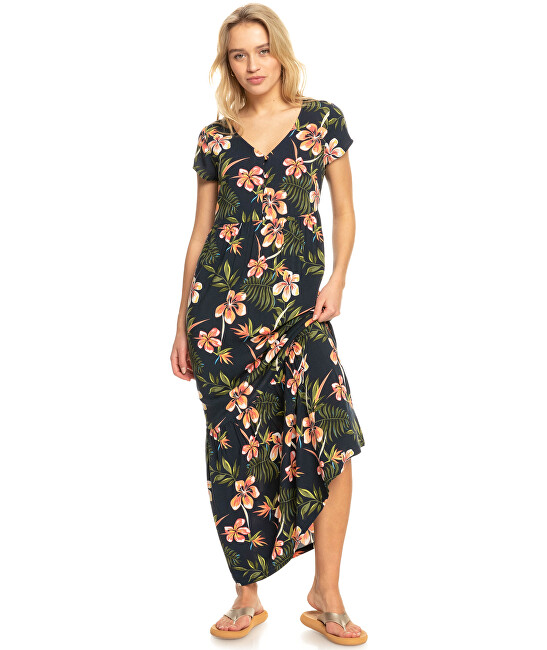 Fustan me lule nga marka Roxy. Me gjatësi maksimale, jakë V me kopsa, dhe mëngë të shkurtra. Materiali: 100% viskozë. Shumëngjyrësh.