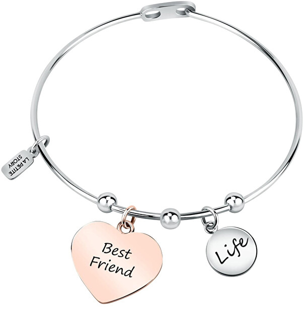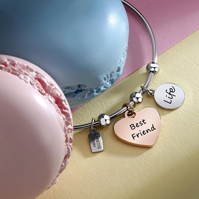 Byzylyk tërheqës dhe solid nga marka La Petite Story, i krijuar nga çeliku i cilësisë më të lartë. E para që do t'ju fitojë është aksesori në formë zemre me tekstin "Best Friend", i zbukuruar me një pendant të rrethuar që ka mbishkrimin "Life", dhe një pendant tjetër të vogël me emrin e markës "LA PETITE STORY". Përmasat e byzylykut janë 6 cm, me mundësi zgjerimi deri në 6.4 cm dhe mbyllje me kapëse. Zbukuroni duart tuaja me një pjesë bizhuterie të pavdekshme që do t'ju sjellë gjithmonë një buzëqeshje në fytyrë.