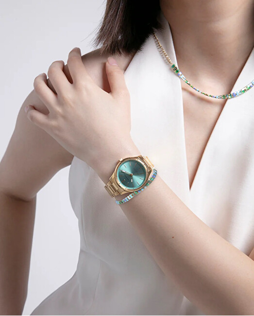 Byzylyk modern për femra nga marka Viceroy. Është i punuar nga çeliku cilësorë praruar me ar të verdhë me trajtim PVD. Byzylyku është i zbukuruar me kristale shumëngjyrëshe në formë drejtkëndëshash që i japin një shkëlqim të veçantë. Gjatësia e byzylykut është 17.5 cm, me mundësi zgjatjeje deri në 2 cm. Mbyllet me kapëse, ndërsa fundi i rregulluesit është dekoruar me një varëse që mban logon e markës. Aksesorë unik dhe ideal për çdo femër.