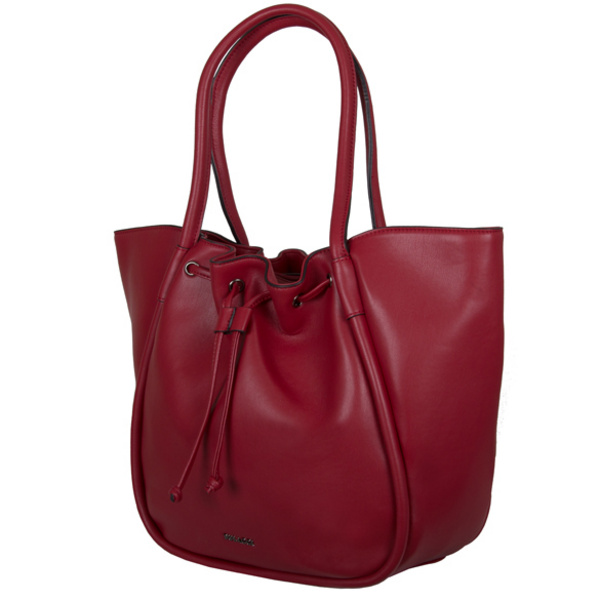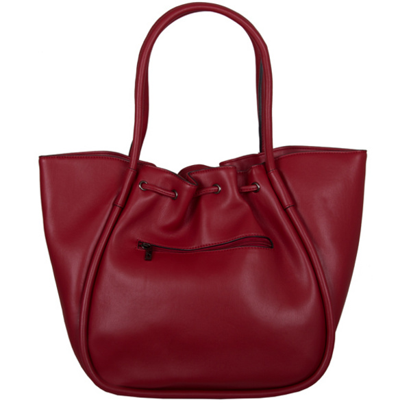 Çantë dore për femra e punuar nga material 100% poliuretan. Vjen me përmasa 42 x 31 x 12 cm, e bërë në ngjyrën e bukur të kuqe të errët. Mbërthehet me zinxhir dhe ka një xhep të brendshëm me fiksim zinxhiri.