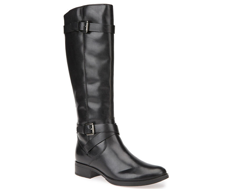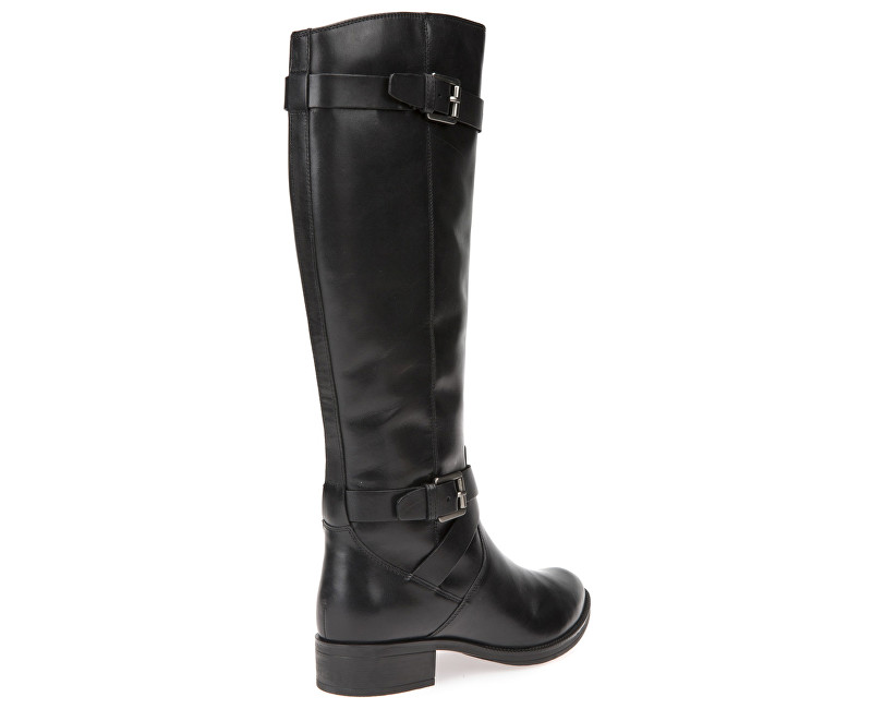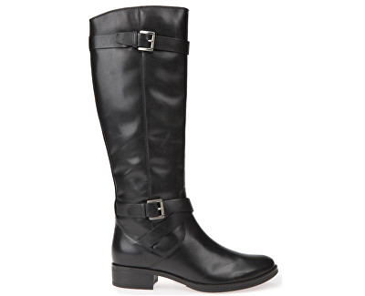 Çizme moderne për femra Geox, të bëra nga lëkura në ngjyrë të zezë. Dizajn me çafë të gjatë dhe mbyllje kryesore me zingjir e rripa praktikë. Do t'ju mbajnë ngrohtë dhe sigurt nga lagështia.