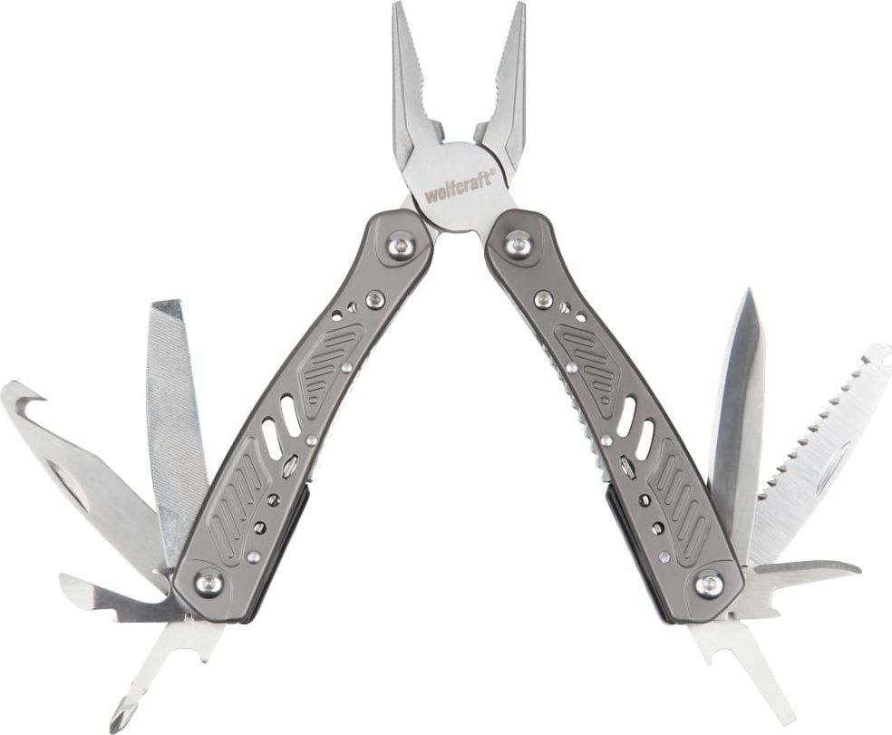 Danat Wolfcraft 13-in-1 424581 janë kompakte dhe të palosshme që përfshijnë 13 funksione të ndryshme - të përshtatshme për projekte DIY, kamping, udhëtime apo riparime të shpejta në shtëpi. Të ndërtuara nga metali cilësor, ato përfshijnë pinca me majë gjilpëre dhe të kombinuara, prerës teli, thikë dhe teh me grep, shpues, kaçavida Phillips dhe me kokë të sheshtë, sharrë, limë të dyanshme për dru dhe metal, si dhe hapëse për kanaçe dhe shishe. Mekanizmi i fiksimit dhe lirimit siguron përdorim të sigurt, duke mbajtur çdo pjesë të qëndrojë mirë në vend gjatë punës. Me përmasa prej 15 x 14 x 2 cm kur paloset, danat ruhen lehtë dhe vijnë me mbështjellës najloni të qëndrueshëm dhe lak për rrip, që e bën të lehtë mbajtjen dhe transportin.