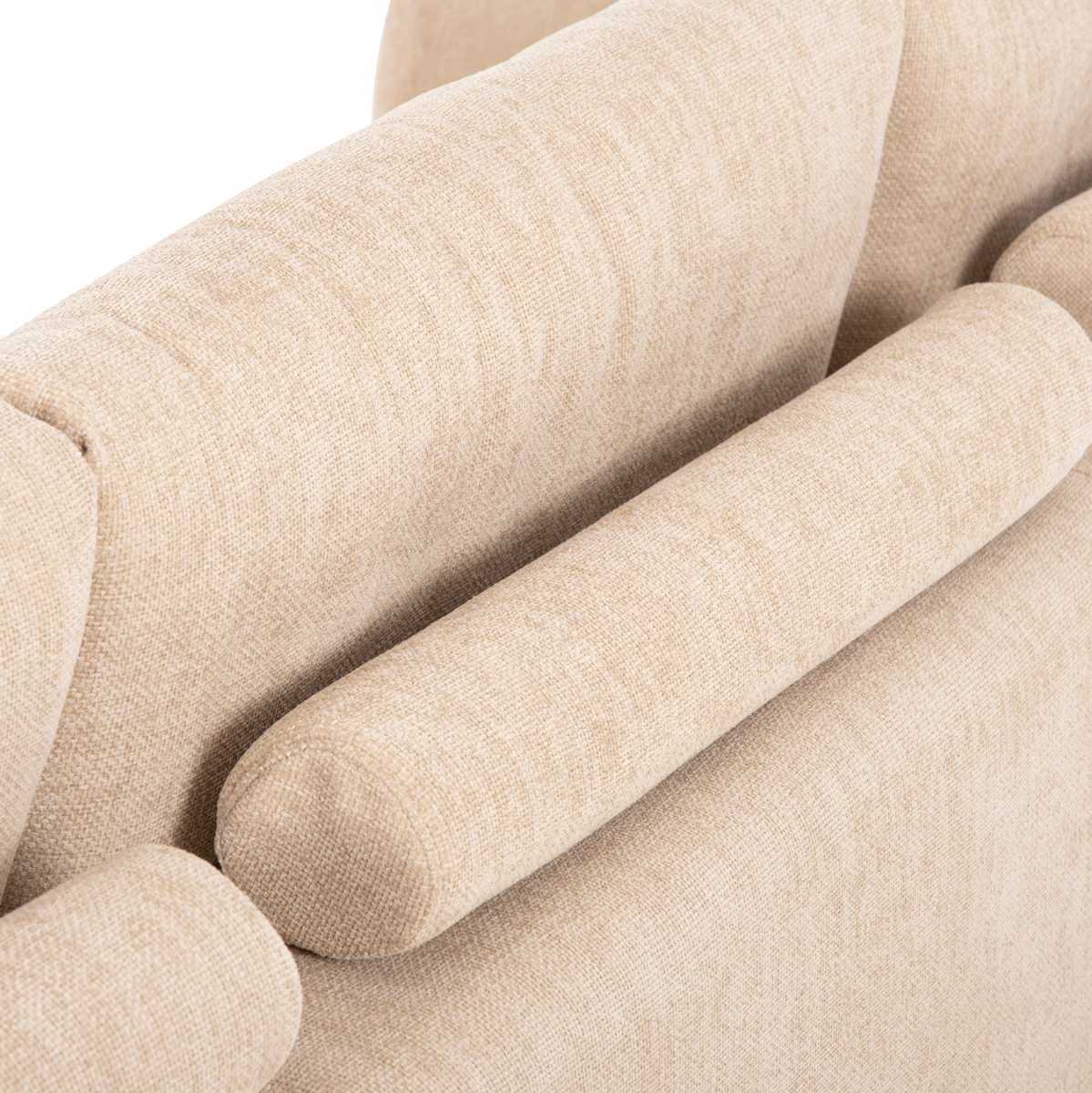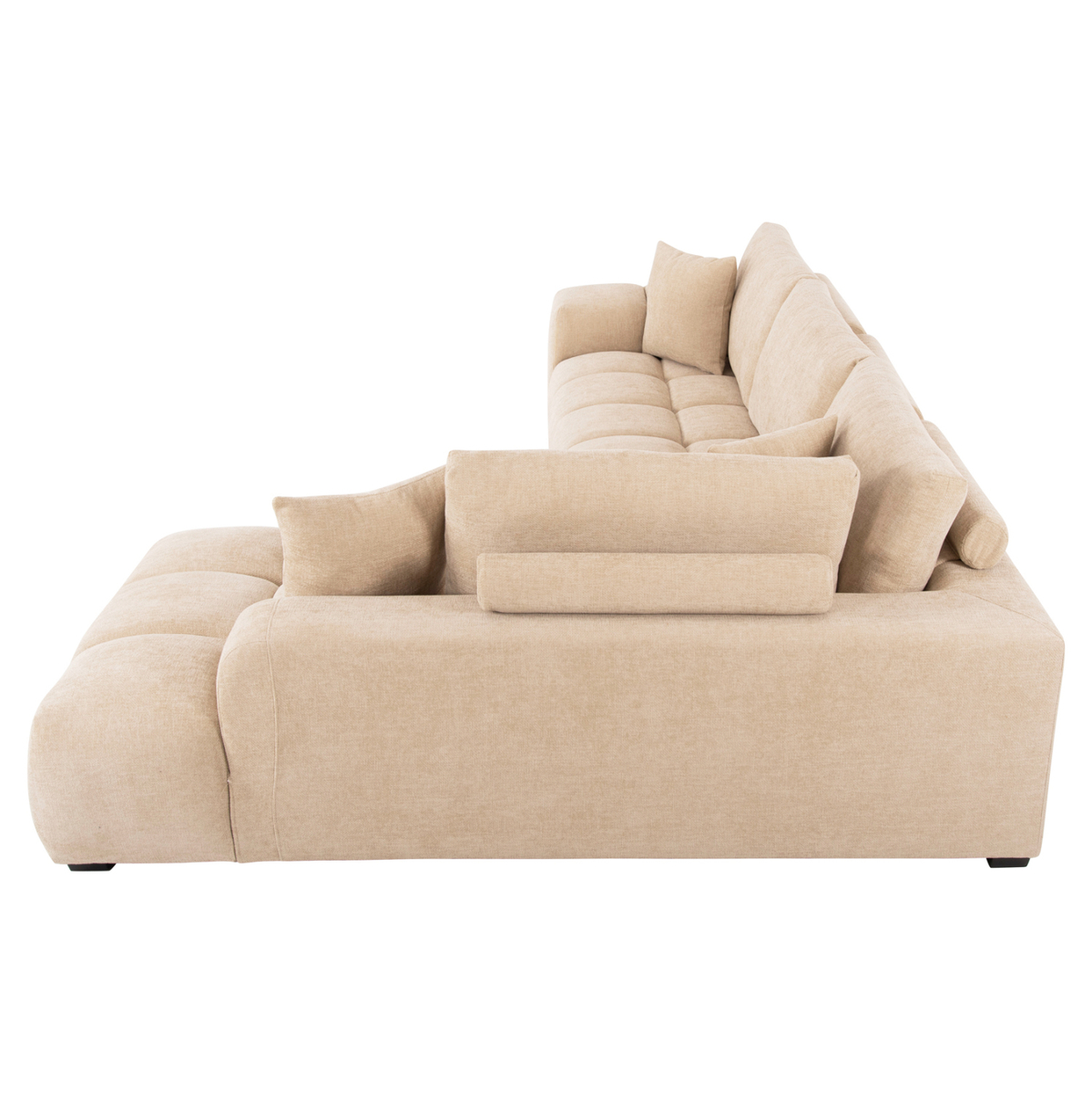 Kjo mobilje elegante, një kënd i madh i mbuluar me pëlhurë cilësore në ngjyrë ecru, do të sjellë një prekje sofistikimi në çdo dhomë ndenjeje. Dizajni i saj unik, me një stil të ulët "apron" dhe baza të gjera të shkurtra në ngjyrë të zezë, e bën atë një pjesë tërheqëse për çdo ambient. Krahët e gjerë dhe mbushja e guximshme me qepje të theksuara krijojnë një pamje të rafinuar. Pjesa që formon këndin lidhet në mënyrë të përsosur me pjesën kryesore të mobiljes, duke ofruar një estetikë të pandërprerë. Mbështetësja e ulët përfshin katër jastëkë të gjatë, të ngushtë cilindrikë për mbështetje të përmirësuar dhe tre jastëkë dekorativë më të vegjël për një prekje shtesë komoditeti. Me mbushje prej shkumës me fortësi mesatare dhe susta xhepi, ky kënd ofron një rehati të pakrahasueshme. Për më tepër, ky produkt vjen me një garanci prej 3 vjetësh për kornizën e tij, duke siguruar qëndrueshmëri dhe besueshmëri. Përmasat e tij të bollshme dhe materialet e kualitetit të lartë, si druri i pishës dhe eukaliptit, shtojnë jo vetëm qëndrueshmëri por edhe një estetikë natyrale dhe tërheqëse. Pavarësisht madhësisë së tij, mirëmbajtja është e thjeshtë; një fshirje e lehtë me një leckë të lagur mjafton për njollat e thjeshta, ndërsa pastrimi i thatë rekomandohet për njollat më të vështira. Kujdesuni që të shmangni përdorimin e pastruesve kimikë. Ky kënd i mrekullueshëm do të dorëzohet i paketuar, i pa montuar, dhe ngjyra mund të ndryshojë pak nga ajo që shfaqet në ekranin tuaj.