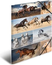 Dosja elastike Herma 19217 në format A3 është zbukuruar me një motiv të këndshëm kuajsh, i printuar si në kapakun e jashtëm, ashtu edhe në tre fletët e brendshme. E ndërtuar nga karton i bardhë dhe i qëndrueshëm, kjo dosje mban dokumente me përmasa deri në 297 × 420 mm në mënyrë të sigurt. Dy rripa elastikë në cepat e saj ndihmojnë që fletët të qëndrojnë në vend gjatë transportit apo ruajtjes. Materiali i fortë i kartonit reziston ndaj përkuljes dhe konsumimit, duke e bërë të përshtatshme për përdorim të përditshëm në shkollë, zyrë apo në shtëpi. Brenda, tre fletët mbrojtëse mbajnë dokumentet në vend dhe i parandalojnë ato të rrëshqasin kur dosja hapet. Struktura e saj kompakte dhe e gatshme për përdorim ofron organizim praktik dhe një pamje lozonjare, ideale për vizatime, fotografi, raporte apo projekte kreative.
