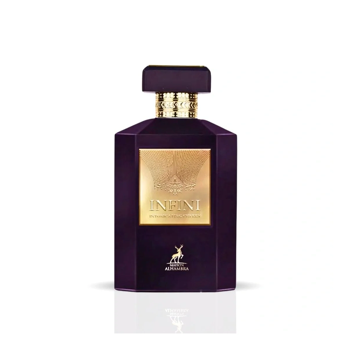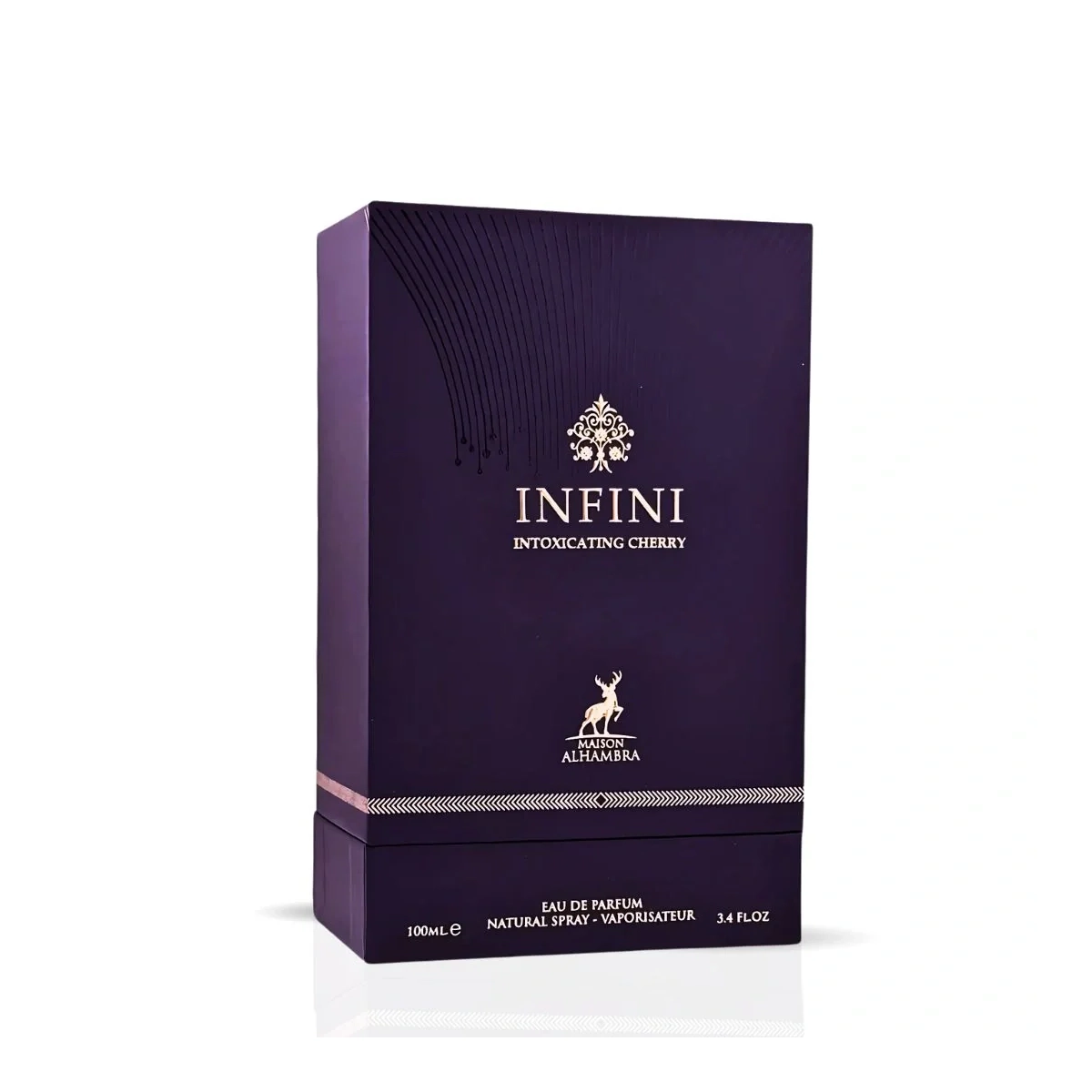 Infini Intoxicating Cherry josh me qershi pikante (piper i zi/rozë) dhe një zemër me konjak e hedione; baza e duhanit, vaniljes, tonkës, kedrit, patchouli-t jep ngrohtësi të thellë gourmand me elegancë të sofistikuar.