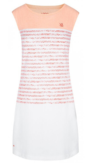Fustan nga marka Loap, i punuar prej pambukut dhe elastanit cilësor. Vjen me gjatësi mbi gjunjë, i bërë në dizajn me jakë rrethore dhe mëngë të shkurta. Fustani ka ngjyrë të portokalltë kombinuar me atë të bardhë dhe model me vija.