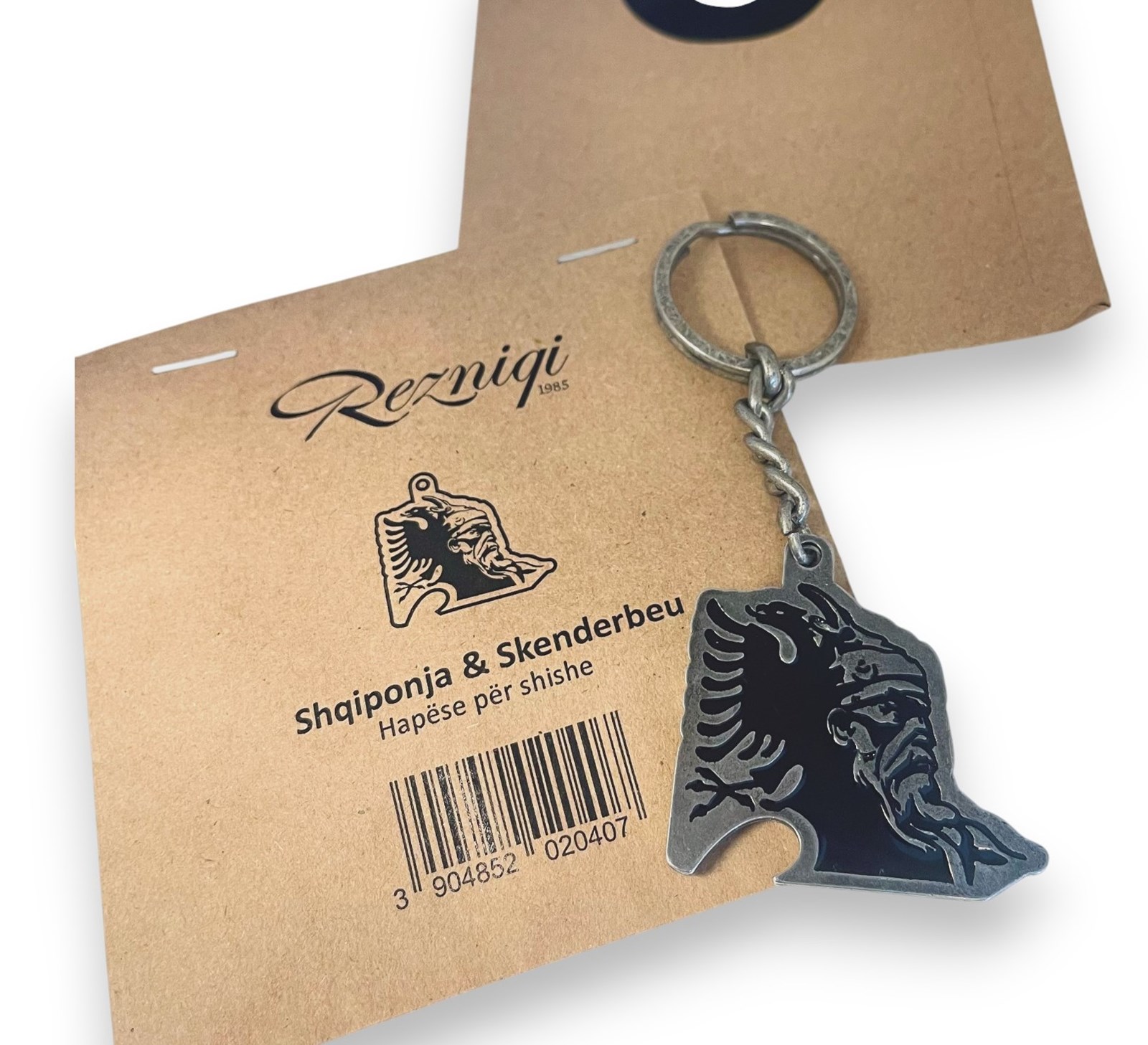 Çelësi për shishe “Shqiponja dhe Skenderbeu” është shtesë e përsosur në koleksionin tuaj të suvenireve! Produkti I dizajnuar për të qenë gjithmonë të gatshëm nëse keni nevojë të hapni ndonjë shishe, bashkon simbolin e shqiptarëve dhe heroin më të madh shqiptar. Më shumë se një simbol, ky çelës është një krenari për trashëgiminë dhe trimërinë shqiptare.