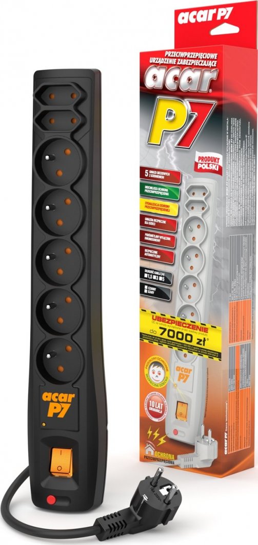 Kablloja zgjatuese Acar përdoret për të lidhur pajisje me fuqi të ulët me të, e cila nuk ka tokëzim dhe ngarkesa e lejuar për këtë lloj hyrjeje është 2,5 A. Falë 7 prizave speciale në kabllo, ju nuk keni pse të shqetësoheni për sigurinë e fëmijës suaj, i cili, i tunduar nga vullneti për të eksploruar. Me ndërprerës të ndriçuar me dy shirita dhe strehim plastik vetë-shuarës. Përmasat: 370 x 65 x 44 mm. Ngjyra: e zezë.