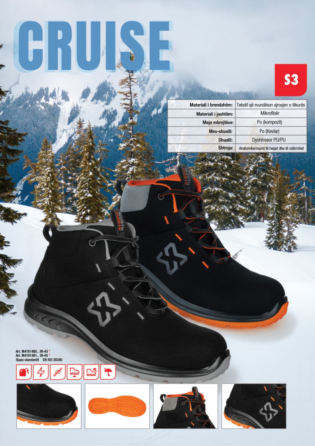 Këpucë për siguri në punë, Würth, Cruise, S3-e thellë Materiali i brendshëm: Tekstil që mundëson ajrosjen e lekurës Materiali i jashtëm: Mikrofibër Maja mbrojtëse: PO - Kompozit Mes-shualli: PO - Kevlar Shualli: Dyshtresor PU/PU Shtroja: Anatomike (mund të heqet dhe të ndërrohet)