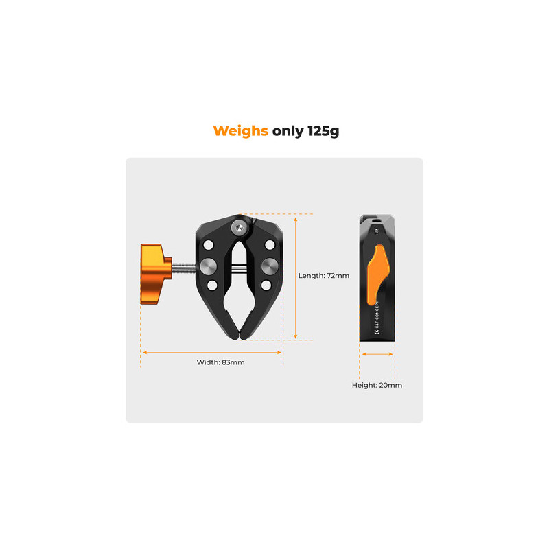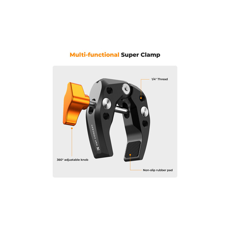 The Ms15 Super Clamp from |K&F Concept is a versatile clamp with a 2.4" jaw capacity. It has rubberized traction pads for secure grip and to prevent marring clamped surfaces. It is made of lightweight aluminum and has a single ergonomic knob for easy operation.
