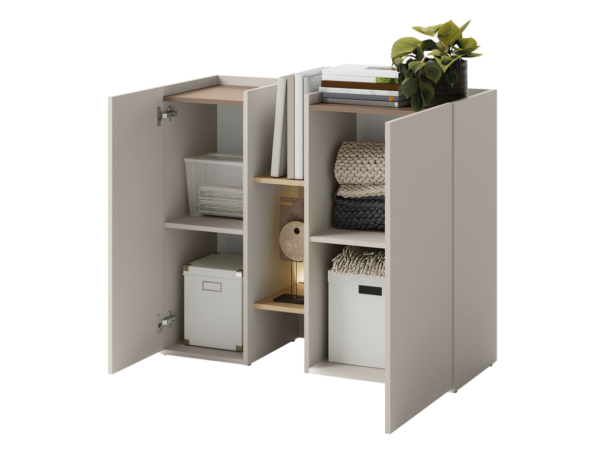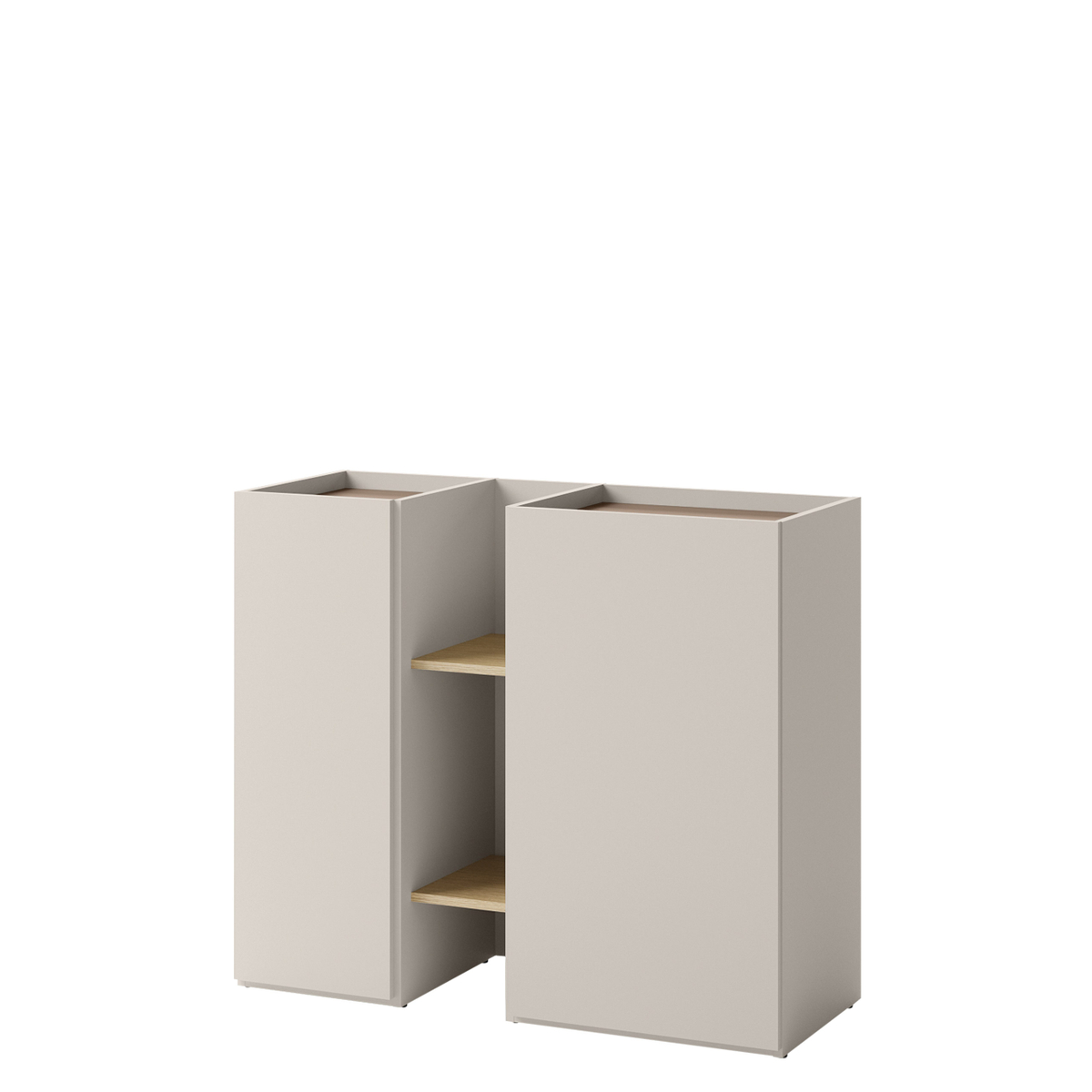 Kjo komodë elegante dhe moderne do të sjellë një frymë të freskët në çdo dhomë. Me një dizajn minimal dhe të rafinuar, ajo është e ndërtuar nga një material i qëndrueshëm, me trupa dhe fronte prej 16 mm trashësi të laminuar, që sigurojnë jetëgjatësi dhe rezistencë ndaj konsumit të përditshëm. Muri i pasmë është i bërë nga HDF me trashësi 3 mm dhe gjithashtu nga chipboard i laminuar 16 mm, duke ofruar një strukturë të fortë dhe të qëndrueshme. Skajet ABS i japin një përfundim të pastër dhe të hijshëm, ndërsa menteshat e konservuara sigurojnë një hapje dhe mbyllje të qetë të dyerve. Pa doreza për një pamje të pastër dhe moderne, komoda qëndron mbi këmbë PVC të rrëshqitshme që e bëjnë të lehtë për t'u zhvendosur sipas nevojës. Për të shtuar një prekje të veçantë, ndriçimi LED është përfshirë në çmim, duke krijuar një atmosferë të ngrohtë dhe mikpritëse në çdo hapësirë. Kjo komodë është zgjedhja e përkryer për ata që kërkojnë një kombinim të stilit dhe funksionalitetit në mobilimin e tyre.