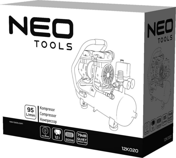 Kompresori pa vaj nga marka Neo me fuqi 500W do të jetë i dobishëm si në shtëpi ashtu edhe në punishte. Kapaciteti i kompresorit është 95 l / min. Falë ajrit të kompresuar, ju mund të lyeni, të hiqni papastërtitë nga vendet e vështira për t'u arritur si dhe të fryni, për shembull, një pishinë kopshti. Kompresori ka një makinë të drejtpërdrejtë, këmbë gome dhe një dorezë për të lehtësuar ndryshimin e pozicionit të pajisjes. Një mbështetje shtesë siguron stabilitet për kompresorin gjatë funksionimit. Pajtueshmëria me standardet evropiane të sigurisë sigurohet nga certifikata CE.