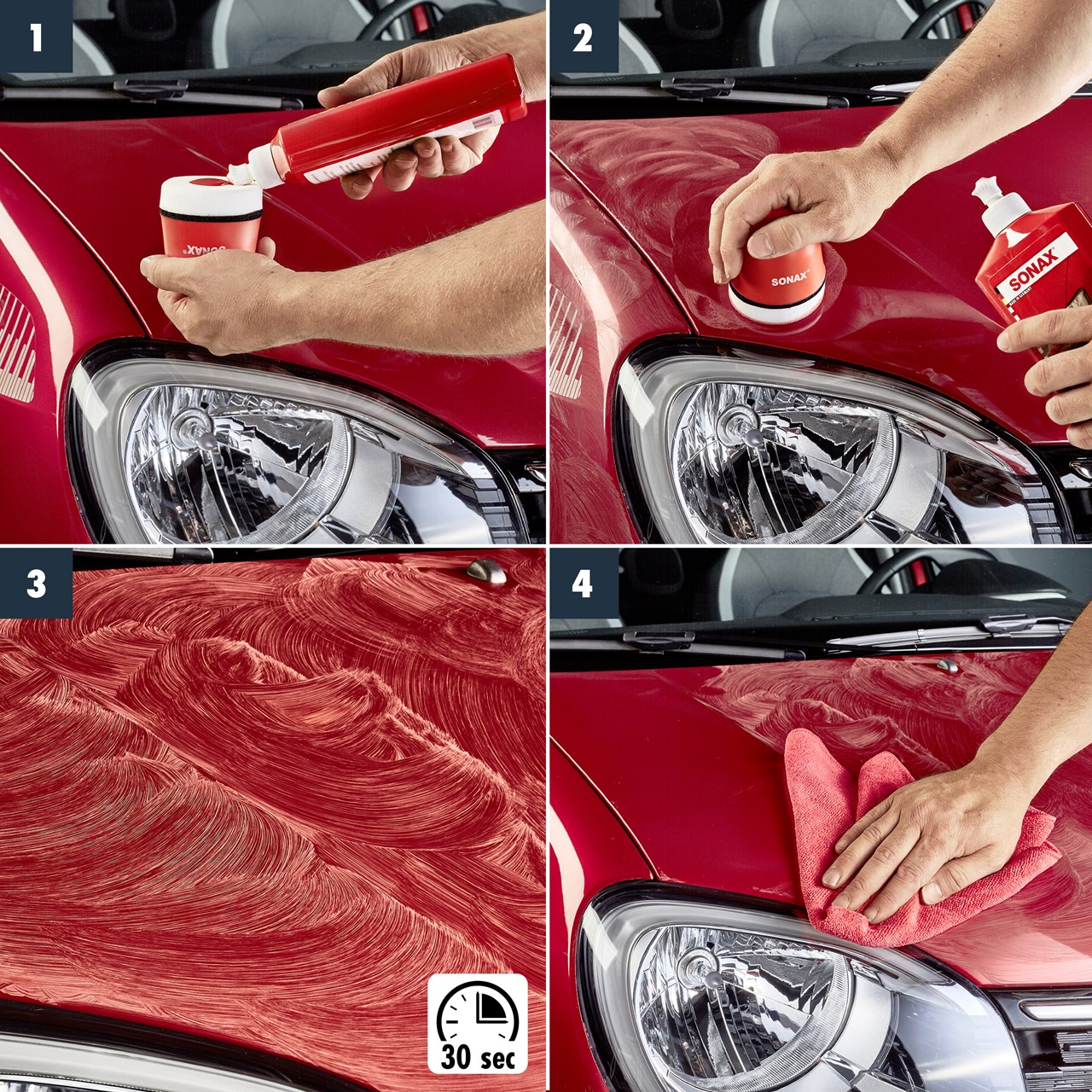 Sonax P-Ball apo Sonax-sfungjer i aplikimit dhe aplikoni produktin menjëherë duke ushtruar presion të lehtë në sipërfaqen e veturës.Lëreni pak të thahet dhe ngjyroseni më një Sonax-leckë mikrofibër. Gjatë polirimit preferohet të trajtohen zona të vogla dhe jo në të njëjtën kohë. Të mos aplikohet në rrezet direkte të diellit ose mbi veturë e cila është e nxehtë. Të mos përdorët në xhama, plastikë, gomë apo në pjesë të pa ngjyrosura të makinës.Mos e mbani në vende të ftohta. Mbajeni larg fëmijëve.