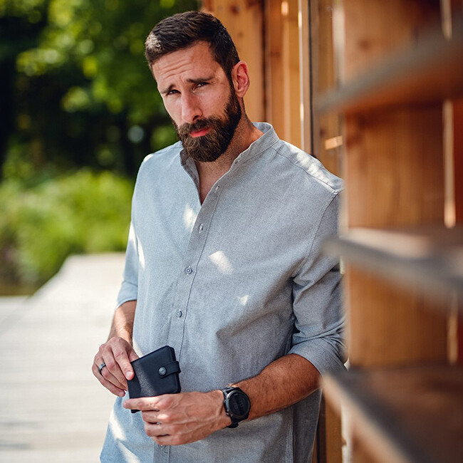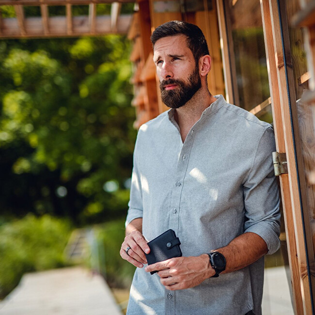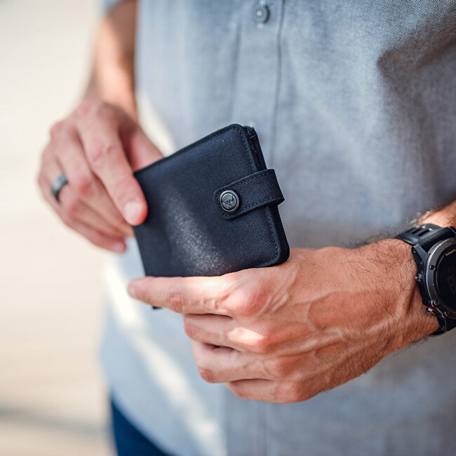 Kuletë moderne për meshkuj, e punuar prej materialit 100% poliester. Posedon fiksim me patentë, xhep të vogël me mbyllje zinxhirë, 4 vende për karta dhe hapësirë të ndarë në dy pjesë për kartmonedha. Dimensionet e kuletës 11 x 9 x 2 cm. Aksesor i leht dhe praktik.