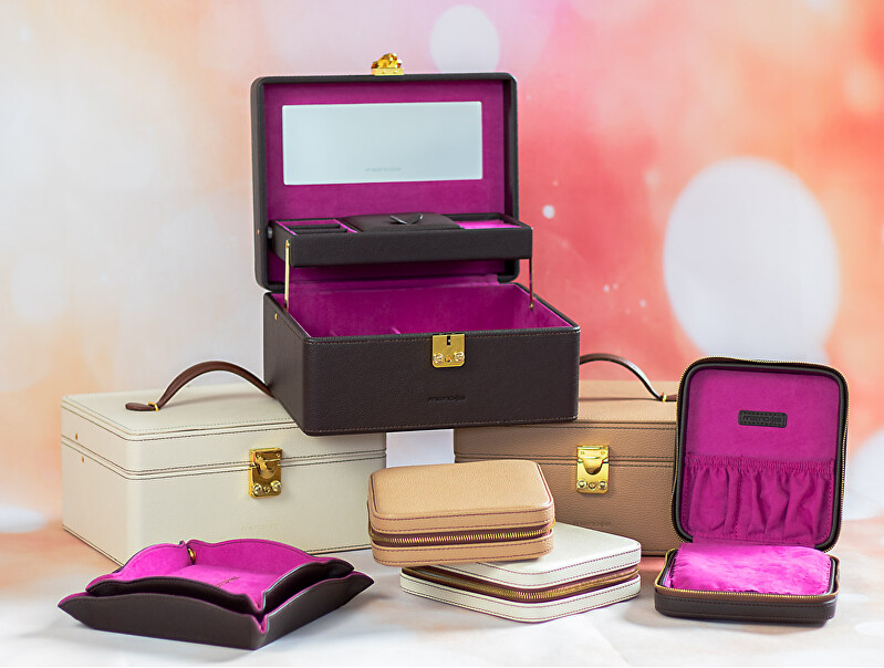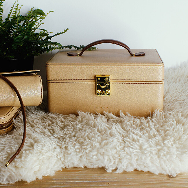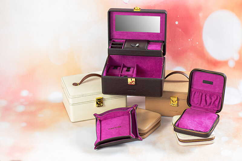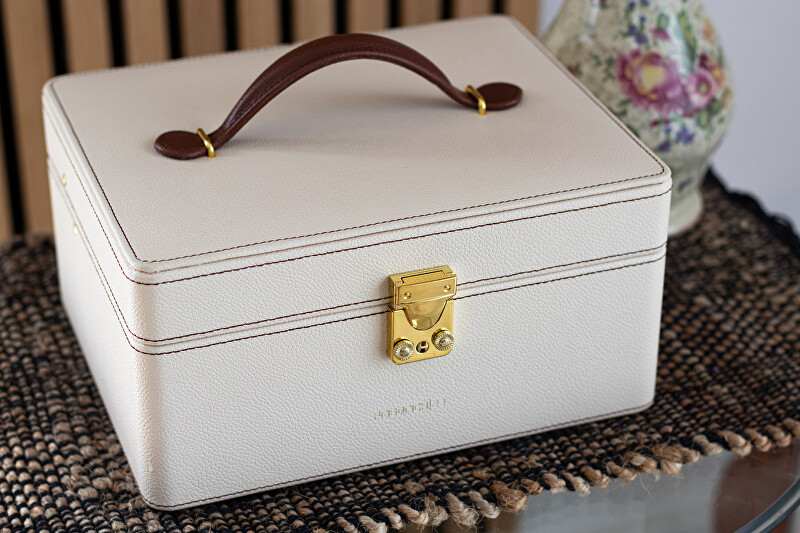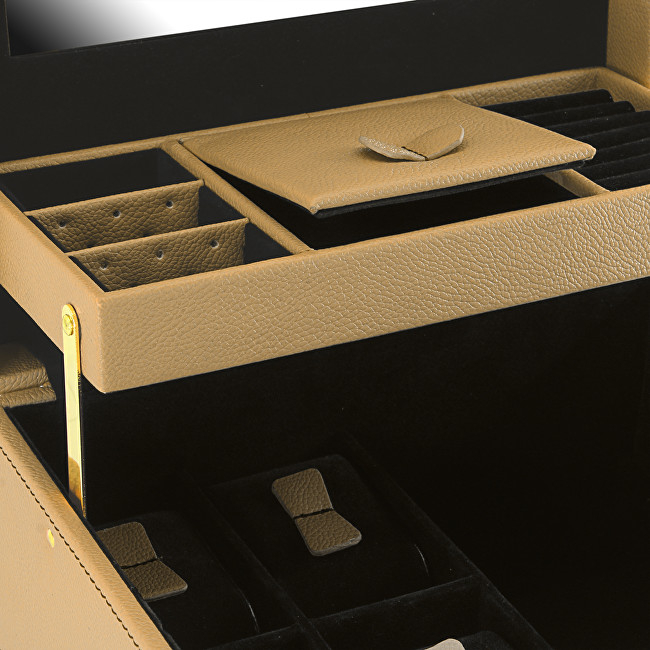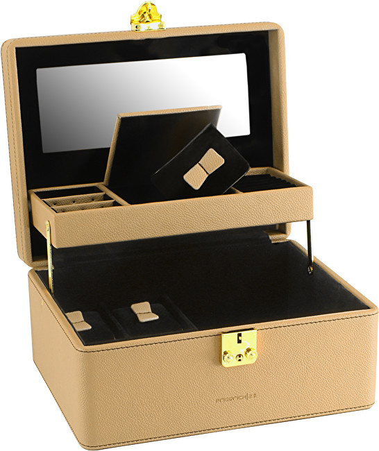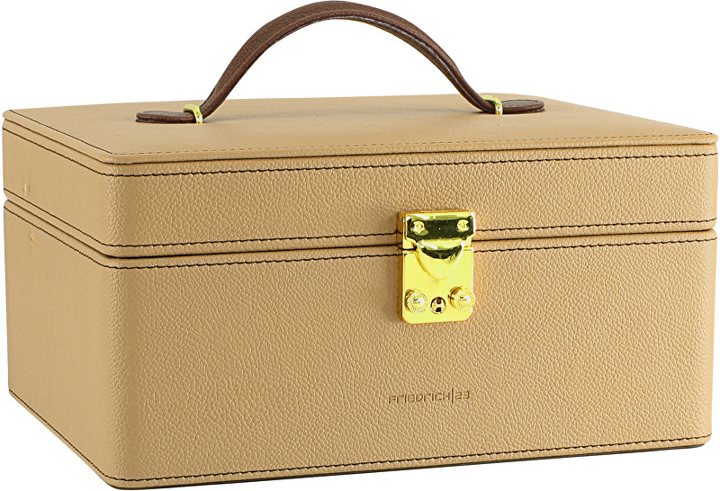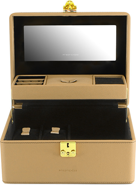 Kuti bizhuterish elegante nga punishtja e markës Friedrich Lederwaren, me ngjyrë të këndshme bejzë në jashtë dhe dizajn të pasur në ngjyrë të zezë brenda. Rafti i sipërm ofron hapësirë për të ruajtur bizhuteritë që mbani më shpesh, ndërsa rafti i poshtëm mund të mbajë deri në katër orë dhe bizhuteri të tjera. Brenda kapakut ka një pasqyrë të ndërtuar për një pamje të plotë, dhe kutia mund të mbyllet për siguri të shtuar. Një mënyrë stilistike dhe praktike për të ruajtur thesaret tuaja.