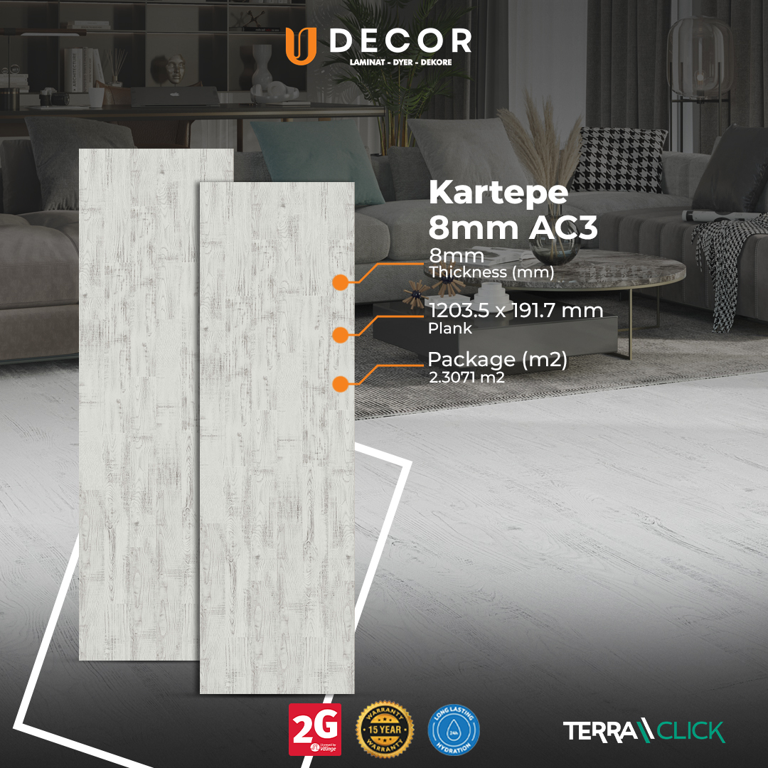 Laminati 8 mm TerraClick KARTEPE nga brendi Yıldız Entegre është një zgjedhje cilësore për dysheme elegante dhe të qëndrueshme. Me klasë AC3, ofron rezistencë të lartë ndaj gërvishtjeve dhe qëndrueshmërim. afatgjatë. Ka rezistencë ndaj ujit deri në 24 orë, sipërfaqe antibakteriale, është pa fuga dhe me sistem instalimi të lehtë. Vjen me garancion 15 vite fabrikisht, i përshtatshëm për çdo ambient të brendshëm.