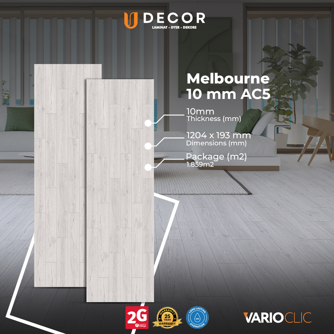 Laminati 10 mm Varioclic MELBOURNE nga brendi Yıldız Entegre është një zgjedhje cilësore për dysheme elegante dhe të qëndrueshme. Me klasë AC5, ofron rezistencë të lartë ndaj gërvishtjeve dhe qëndrueshmërim. afatgjatë. Ka rezistencë ndaj ujit deri në 24 orë, sipërfaqe antibakteriale, është me fuga dhe me sistem instalimi të lehtë. Vjen me garancion 25 vite fabrikisht, i përshtatshëm për çdo ambient të brendshëm.