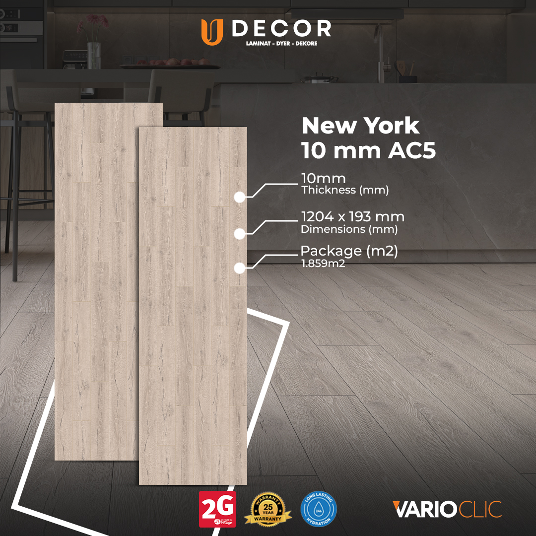 Laminati 10 mm Varioclic NEW YORK nga brendi Yıldız Entegre është një zgjedhje cilësore për dysheme elegante dhe të qëndrueshme. Me klasë AC5, ofron rezistencë të lartë ndaj gërvishtjeve dhe qëndrueshmërim. afatgjatë. Ka rezistencë ndaj ujit deri në 24 orë, sipërfaqe antibakteriale, është me fuga dhe me sistem instalimi të lehtë. Vjen me garancion 25 vite fabrikisht, i përshtatshëm për çdo ambient të brendshëm.