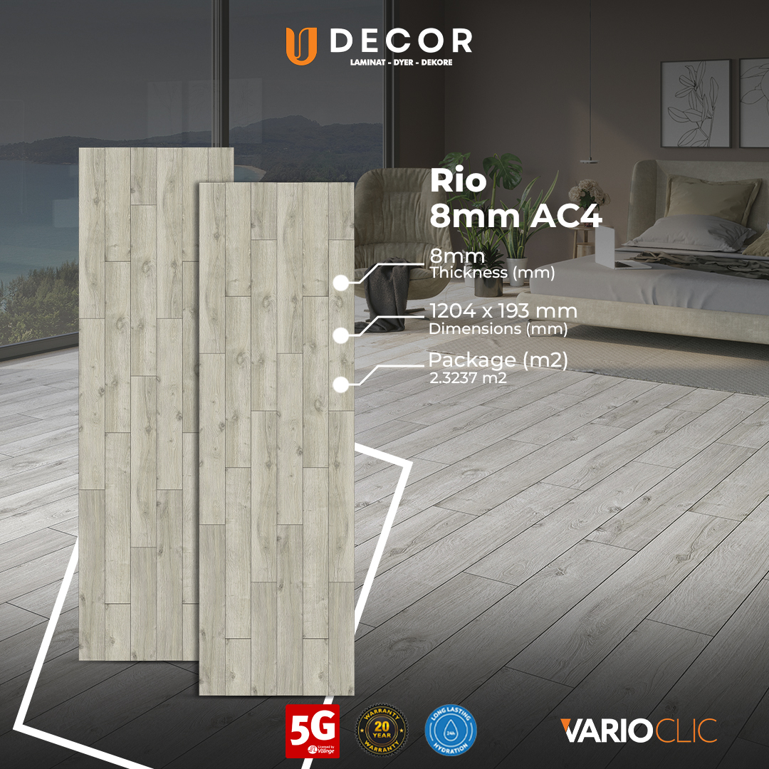 Laminati 8 mm Varioclic RIO nga brendi Yıldız Entegre është një zgjedhje cilësore për dysheme elegante dhe të qëndrueshme. Me klasë AC4, ofron rezistencë të lartë ndaj gërvishtjeve dhe qëndrueshmërim. afatgjatë. Ka rezistencë ndaj ujit deri në 24 orë, sipërfaqe antibakteriale, është me fuga dhe me sistem instalimi të lehtë. Vjen me garancion 20 vite fabrikisht, i përshtatshëm për çdo ambient të brendshëm.
