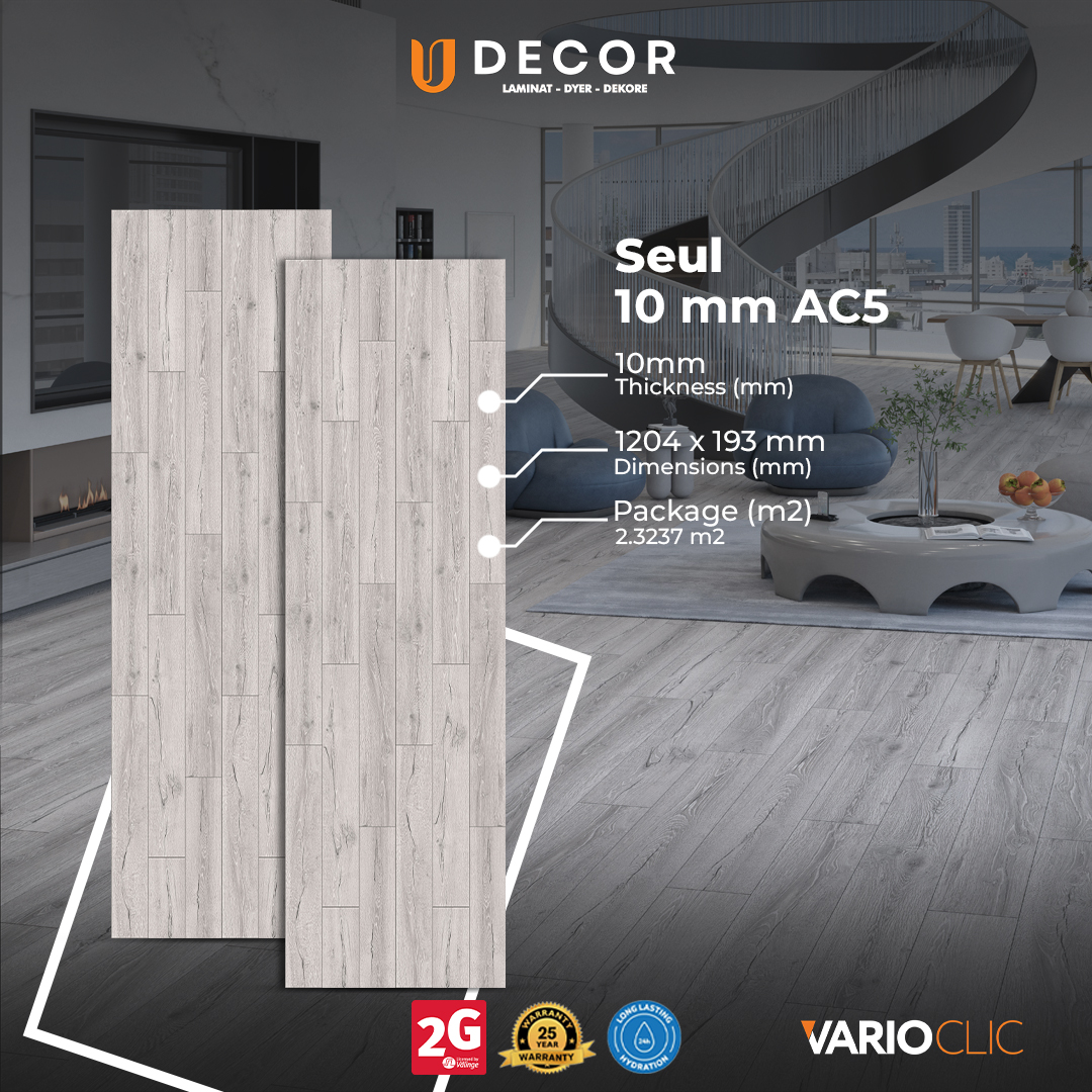 Laminati 10 mm Varioclic SEUL nga brendi Yıldız Entegre është një zgjedhje cilësore për dysheme elegante dhe të qëndrueshme. Me klasë AC5, ofron rezistencë të lartë ndaj gërvishtjeve dhe qëndrueshmërim. afatgjatë. Ka rezistencë ndaj ujit deri në 24 orë, sipërfaqe antibakteriale, është me fuga dhe me sistem instalimi të lehtë. Vjen me garancion 25 vite fabrikisht, i përshtatshëm për çdo ambient të brendshëm.