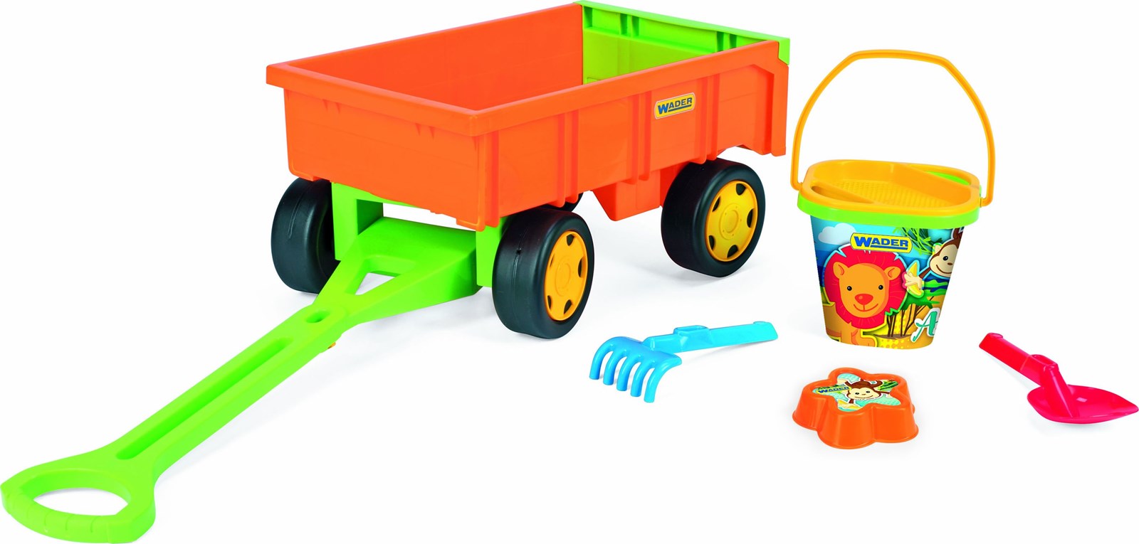 Trailer with Sand Kit është një lodër argëtuese, e sigurt dhe e qëndrueshme e krijuar për të kënaqur dhe për të angazhuar fëmijët. Me një kapacitet ngarkese deri në 60 kg, kjo karrocë është e përkryer për lojëra në natyrë dhe përfshin një sërë pajisjesh verore: një lopatë, grabujë, kallëp, sitë dhe një kovë të stolisur me grafika të gjalla të krijuara duke përdorur metodën e qëndrueshme IML, duke siguruar rezistencë ndaj ujit dhe ekspozimit në diell. Prodhuar në Poloni nga materiale jo toksike dhe të qëndrueshme, karroca vjen me ngjyra të gjalla verore, duke e bërë atë tërheqëse vizualisht dhe të sigurt për orë të pafundme lojë krijuese.