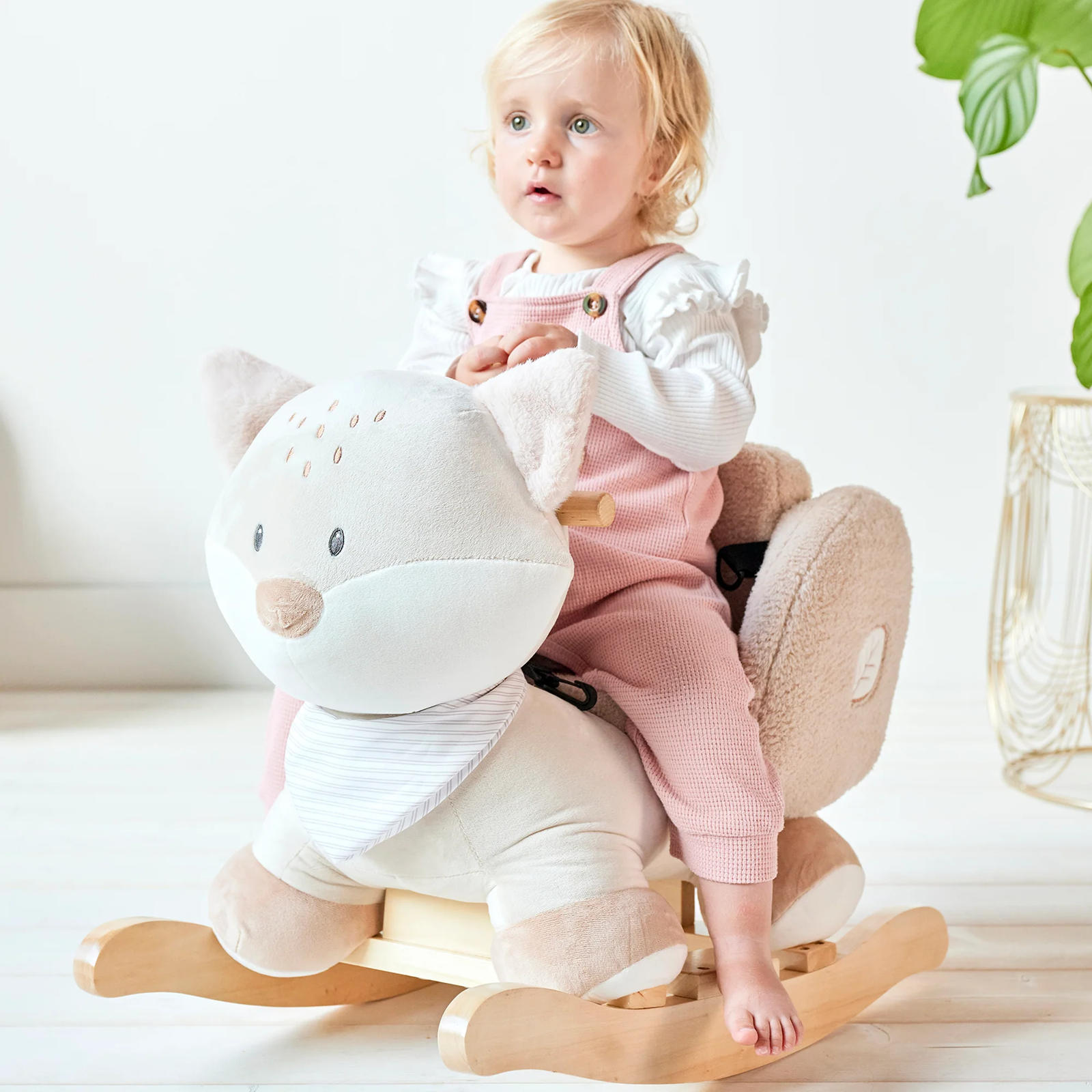 Një ulëse lëkundese që sjell qetësinë në çdo moment. Lëkundësja vjen në nuancë të lehtë të gjelbër pastel, me formën elegante të dhelpres që tërheq vëmendjen e më të vegjëlve. Formulimi i butë dhe i lehtë e bën atë një shoqe ideale për karrocë, krevat apo karrige, duke sjellë rehati dhe argëtim në udhëtimet e përditshme. Forma të kapshme si veshi, bishti apo trup i butë i ofrojnë fëmijës mundësi për zhvillim shqisor dhe motror, duke inkurajuar prekjen dhe ndërveprimin, në çdo prekje delikate dhe të sigurt.