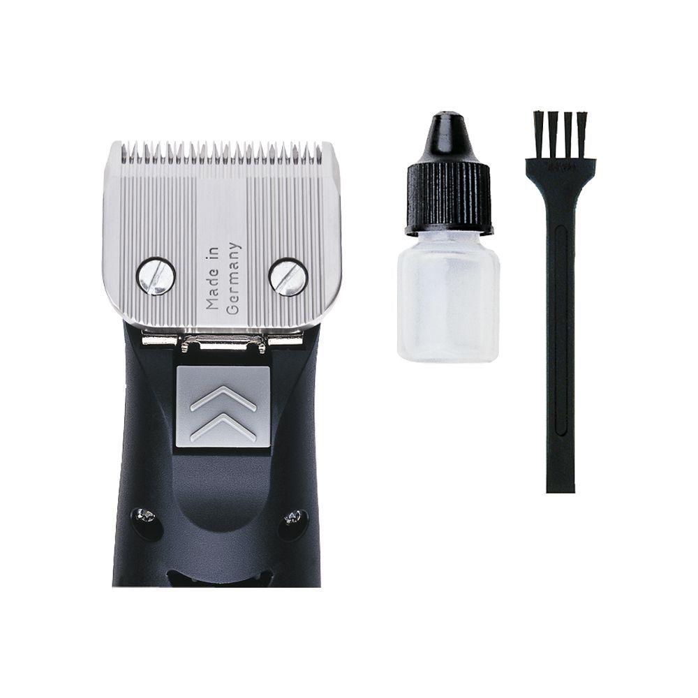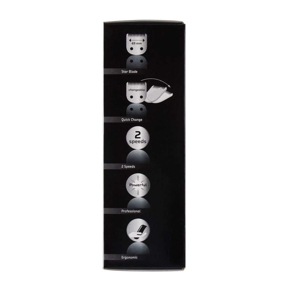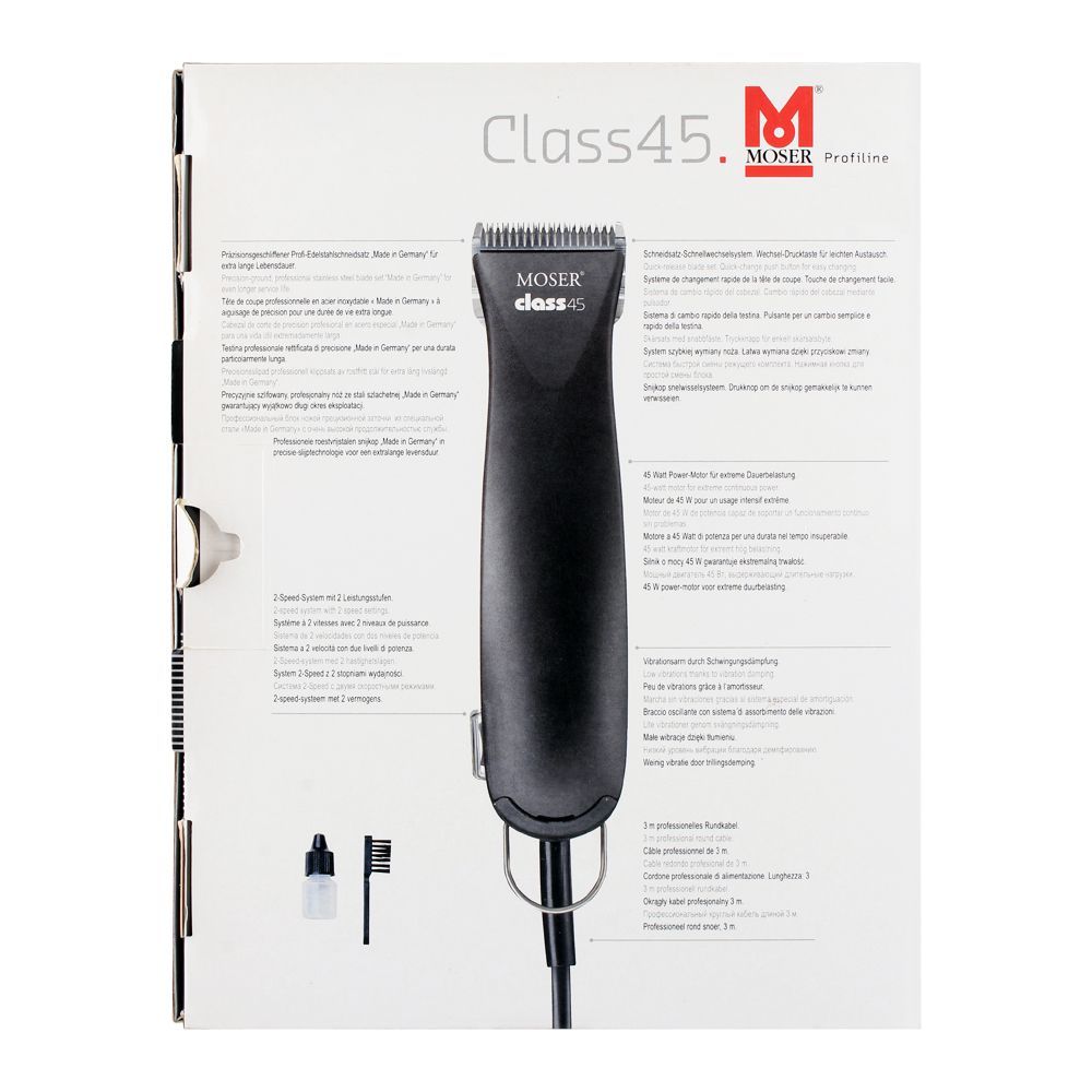 Moser Class 45 Professional Motor Corded Hair Clipper ka një set gërshërë prej çeliku inox të përpunuar me precizion Star Blade me gjerësi 49 mm, me cilësi të provuar për jetëgjatësi të gjatë, “Made in Germany”. Gjatësia e prerjes është 1 mm dhe seti i gërshërëve mund të shkëputet shpejt, me gamë të gjerë të seteve të ndryshme të gërshërëve. Ka sistem me 2 shpejtësi dhe motor me fuqi 45 W për përdorim ekstrem pa ndërprerje, me rreth 2400/3000 rpm dhe është pa dridhje falë sistemit të absorbimit të goditjeve. Përdor tensionin optimal 230-240 V me frekuencë 50-60 Hz dhe ka kabllo 3 metra. Ftohja është optimale dhe pastrimi i lehtë falë filtrit të ajrit që mund të zëvendësohet. Dizajni është ergonomik dhe i përshtatshëm për përdorim profesional, i besueshëm dhe i lehtë për tu përdorur. Përfshin furçë pastrimi dhe vaj për lubrifikim. Dimensionet janë 185 x 46 x 48 mm dhe pesha 520 gram. Ngjyra e makinës është e zezë. Për kujdesin, makina duhet të pastrohet dhe të mbahet mirë për të siguruar performancë të qëndrueshme dhe jetëgjatësi të gjatë të gërshërëve. Seti i gërshërëve duhet të pastrohet me furçë pas çdo prerjeje dhe të lubrifikohet çdo ditë për të reduktuar fërkimet, nxehtësinë dhe konsumimin si dhe për t’i mbrojtur nga ndikimet mjedisore. Ju lutemi lexoni me kujdes të gjitha udhëzimet para përdorimit për t’u njohur me makinën tuaj të re prerëse flokësh.