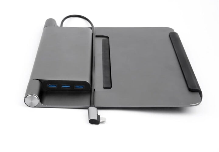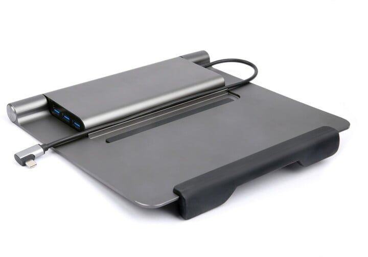Një mbajtëse e shkëlqyer për laptopë dhe Macbook me një diagonale nga 11.6" në 15.6" dhe një stacion të integruar USB-C 5në1, e cila ju tërheq me përpunim me saktësi të lartë nga një aliazh i fortë alumini. Falë lartësisë së mbajtëses, laptopi nuk shtrihet drejtpërdrejt në tavolinë dhe ftohet më shumë nga fluksi i ajrit nga poshtë. Stacioni i integruar docking ofron lidhje kabllo të llojit C për lidhje me laptop, HDMI, USB-C dhe 3x USB-A. E përputhshme me sistemet operative Windows, Mac OS, Android, Linux, Chrome. Mbajtësja mund të paloset lehtësisht dhe të merret me vete kudo.