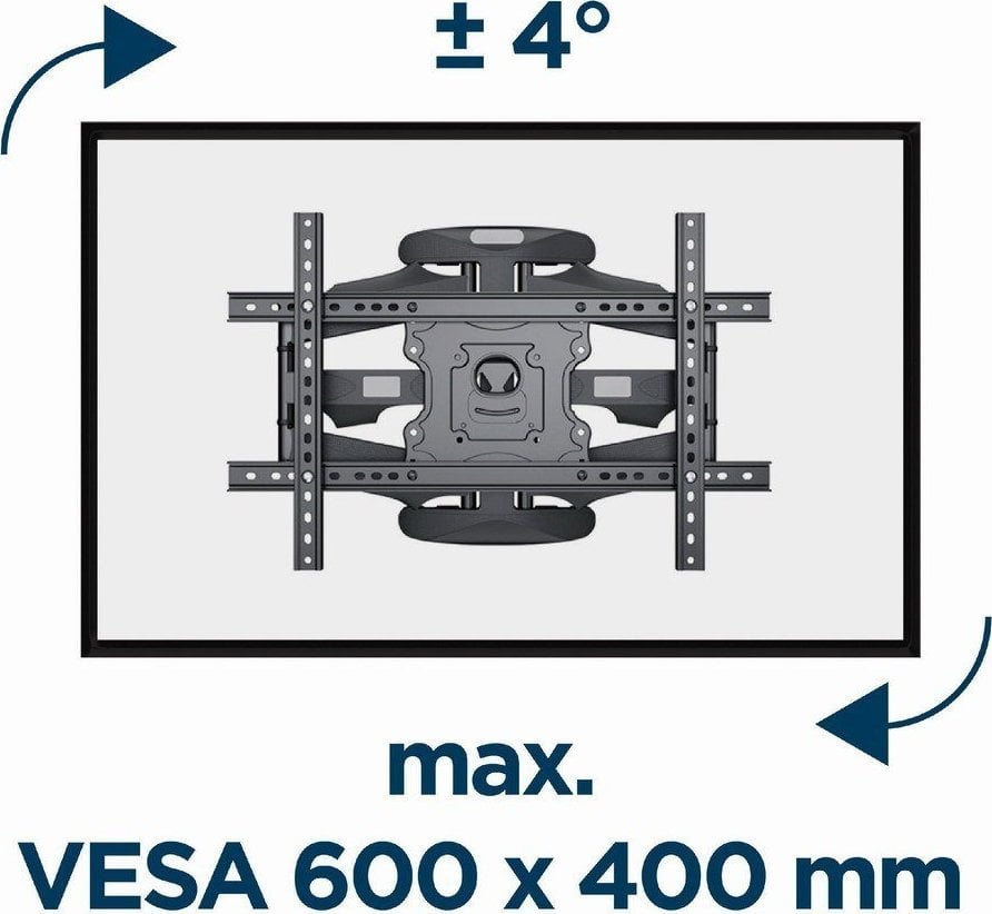 Kjo mbajtëse në mur është bërë prej çeliku të qëndrueshëm dhe ka një përfundim të zi të lëmuar, me peshë 6,55 kg. Ai mbështet një madhësi maksimale të ekranit prej 75 inç (190,5 cm) dhe strehon montime VESA deri në 600x400 mm. Montimi lejon një rrotullim 100° dhe një gamë animi prej -5° deri në 8°, duke siguruar kënde shikimi fleksibël. Projektuar për të mbajtur një ekran të vetëm me një kapacitet ngarkese maksimale prej 45 kg, është ideal për ekrane të mëdha. Produkti vjen me një çantë montimi dhe udhëzues përdorimi, të paketuar në një kuti me përmasa 575 mm (gjerësi), 70 mm (lartësi) dhe 435 mm (thellësi).