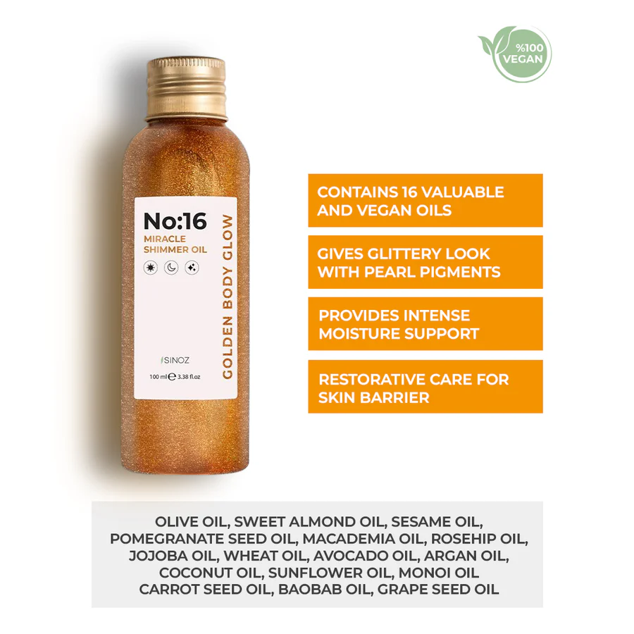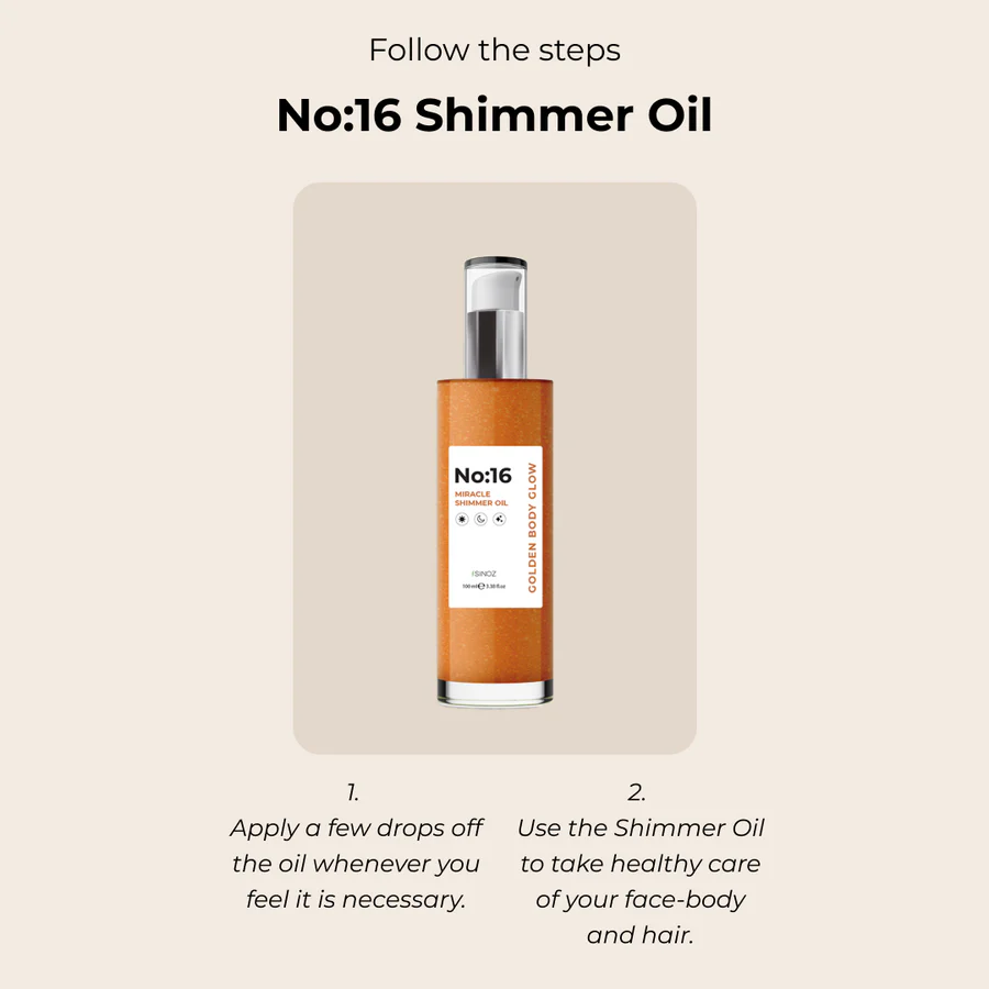 NO:16 Miracle Shimmer Oil i jep lëkurës një shkëlqim natyral dhe rrezatues; me teksturë të lehtë, përthithet shpejt dhe nuk lë yndyrë në lëkurë; ushqen dhe rigjallëron lëkurën me hidratim intensiv; NO:16 Miracle Shimmer Oil mban emrin nga 16 vajrat mrekullie të përzgjedhur me kujdes për këtë vaj natyral për fytyrë, trup dhe flokë; përmban: 1. Vaj ulliri 2. Vaj bajame të ëmbël 3. Vaj susami 4. Vaj fara shege 5. Vaj makadamie 6. Vaj trëndafili të egër 7. Vaj jojoba 8. Vaj gruri 9. Vaj avokado 10. Vaj argani 11. Vaj kokosi 12. Vaj luledielli 13. Vaj fara karrote 14. Vaj baobabi 15. Vaj fara rrushi 16. Vaj Monoï