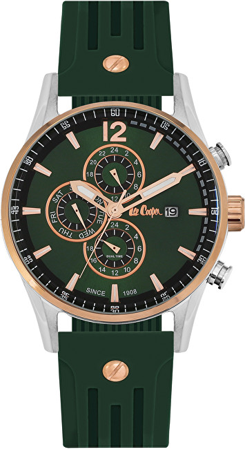 Përjetoni elegancën dhe ndjehuni bukur me orën e dizajnuar enkas për meshkuj nga Lee Cooper, e cila vjen e kombinuar me një brez me material nga silikoni. Ky aksesor plotëson çdo veshje në përsosmëri sepse është kombinim i rripit me ngjyrë jeshile të mbyllët dhe kornizës nga metali i qëndrueshëm pjesërisht e veshur me ari, kombinime këto që ndërthuren mjaft bukur dhe japin ndjesi të këndshme. Ora ka numrator në ngjyrë të gjelbërt, dekoruar me tre kronografë, indekse dhe akrepa me po të njëjtën ngjyrë me kornizën. Ky aksesor është rezistent ndaj ujit deri në 3BAR/ATM dhe ka mekanizëm të modelit QUARTZ. Plotësoni pamjen tuaj dhe vëjeni në pah stilin tuaj unik me aksesorët si kjo orë.