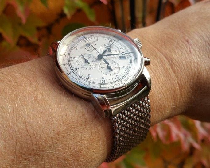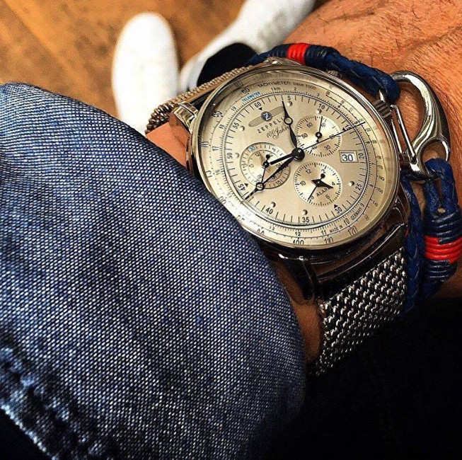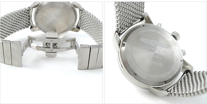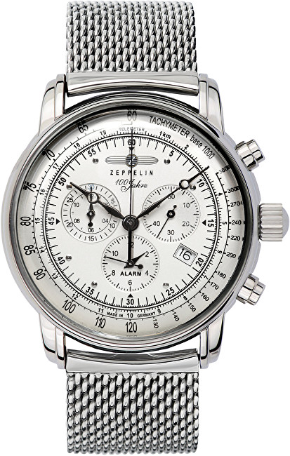 Edicioni special i markës Zeppelin kombinon elemente klasike dhe elegante si numratori harkor me thekse moderne. Modeli luksoz për burra i kësaj marke komplimenton në mënyrë të përkryer dorën tuaj me këllëfin e bukur prej çeliku të kualitetit të lartë. Numratori i bukur mbrohet nga një xham i fortë mineral. Me një diametër të këllëfit prej 42 mm, produkti hyn në kategorinë e orëve më të mëdha. Modeli është mundësuar nga Ronda 5130.D, me një bateri kuarc zvicerane e cila përmban 6 gurë. Produkti është i papërshkueshëm nga uji deri në 50m dhe nuk dëmtohet gjatë dushit. Një aksesor klasik i pajisur edhe me një alarm dhe i përshtashëm për të gjitha llojet e eventeve.