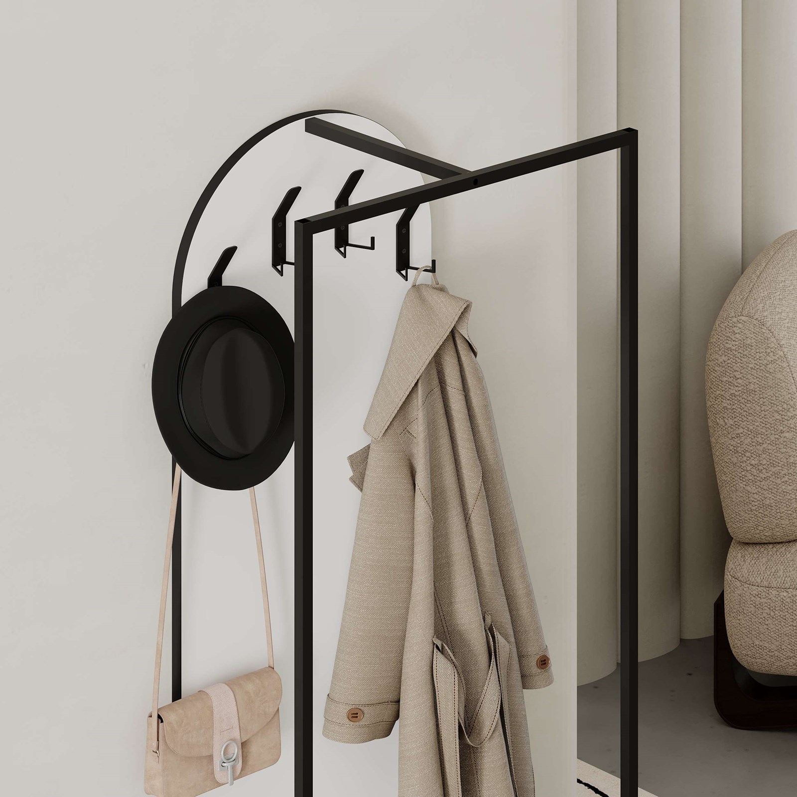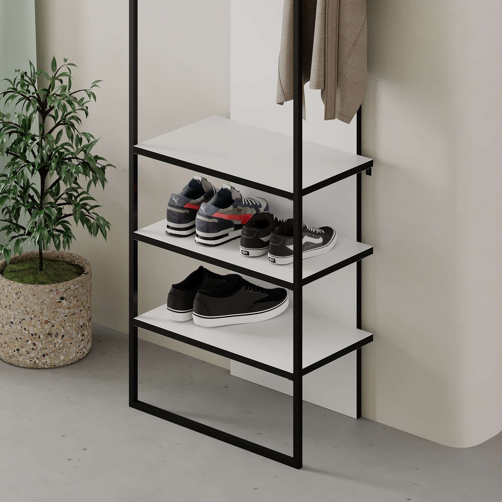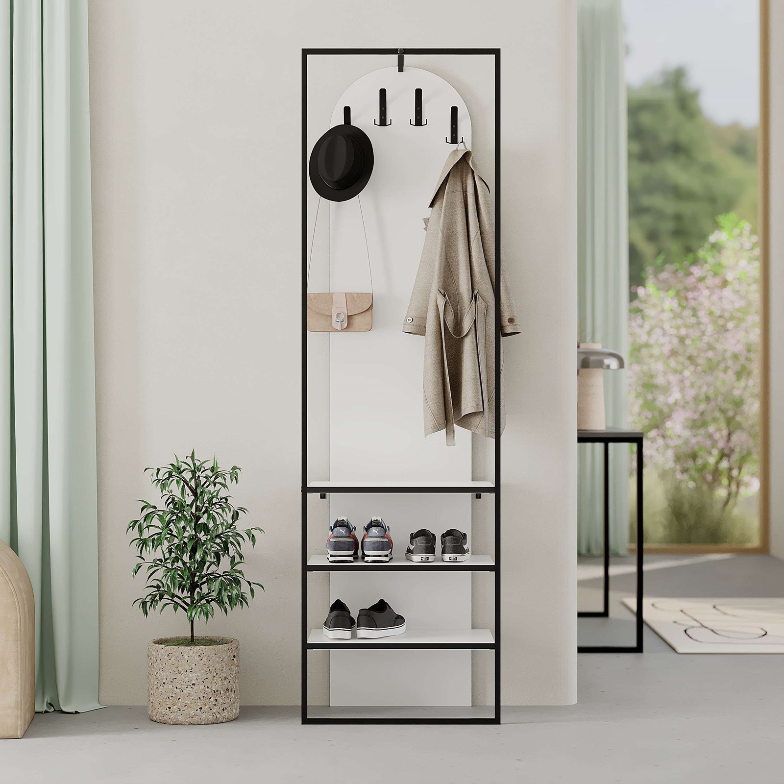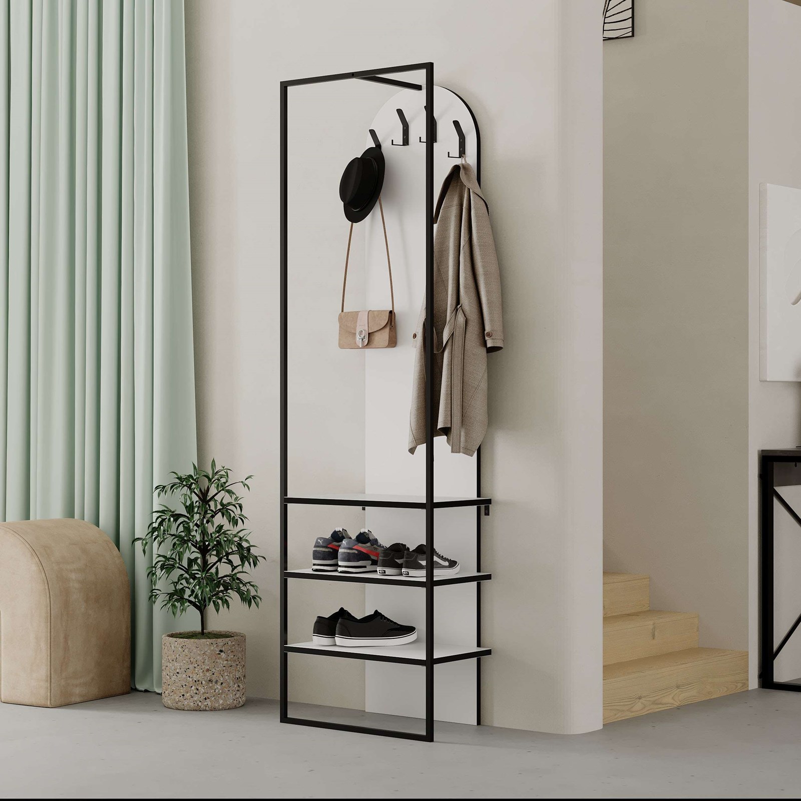 Hapësirë e bollshme ruajtjeje: Përmban 3 rafte të hapura për këpucë dhe 4 grepa të fortë metalikë për pallto, kapele dhe çanta.