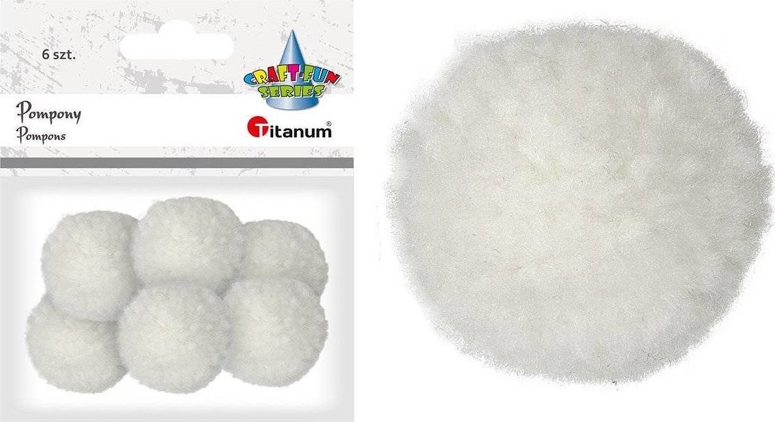 Pompone të bardha për kapele, me gëzof, të bëra me fije të buta. Ato janë të përkryera për të qepur kapele, veshje, këllëf jastëku, batanije, qilima, perde, etj. Pomponet mund të futen në fije dhe tela kur krijoni bizhuteri, ose mund të ngjiten në sipërfaqe të ndryshme. Ato janë perfekte për vepra arti në kopsht dhe shkollë ose si një shtesë e letrave dhe kartave. Paketa përmban 6 copë me diametër 30 mm.