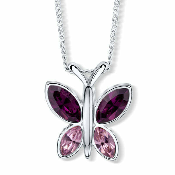 Qaforja simpatike nga marka CRYSTalp është punuar nga metali i bizhuterive. Sipërfaqja e veshur me rodium zvogëlon shfaqjen e reaksioneve alergjike dhe ruan shkëlqimin. Dekorohet me varëse të bukur në formë fluture të zbukuruar me kristale vjollcë dhe rozë. Madhësia e varëses: 1.7 cm. Gjatësia e zinxhirit: 42 cm.