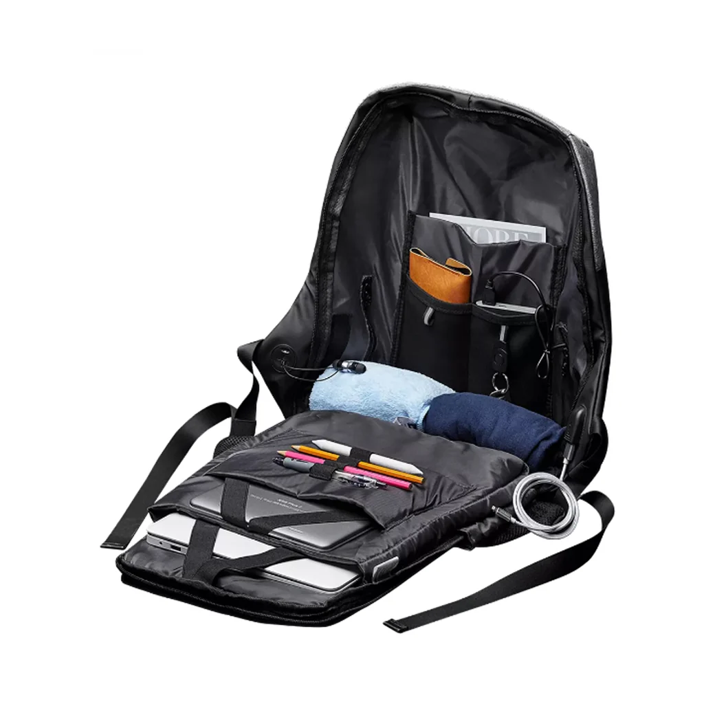 Kapaciteti: 20L Zinxhir i fshehur kundër vjedhjes Lidhës i jashtëm i ngarkimit USB 2.0 Hapje 180° I mbrojtur nga prerjet I papërshkueshëm nga uji Kapacitet i madh, 11 xhepa Fiksohet me butona metalikë dhe Velcro brenda Ruan formën Rrip për fiksimin e një çantë shpine në një dorezë valixhe
