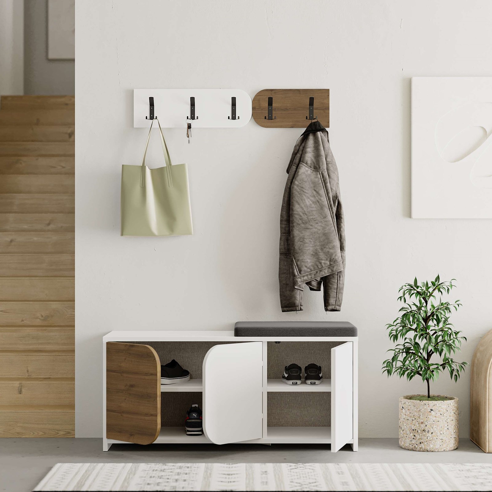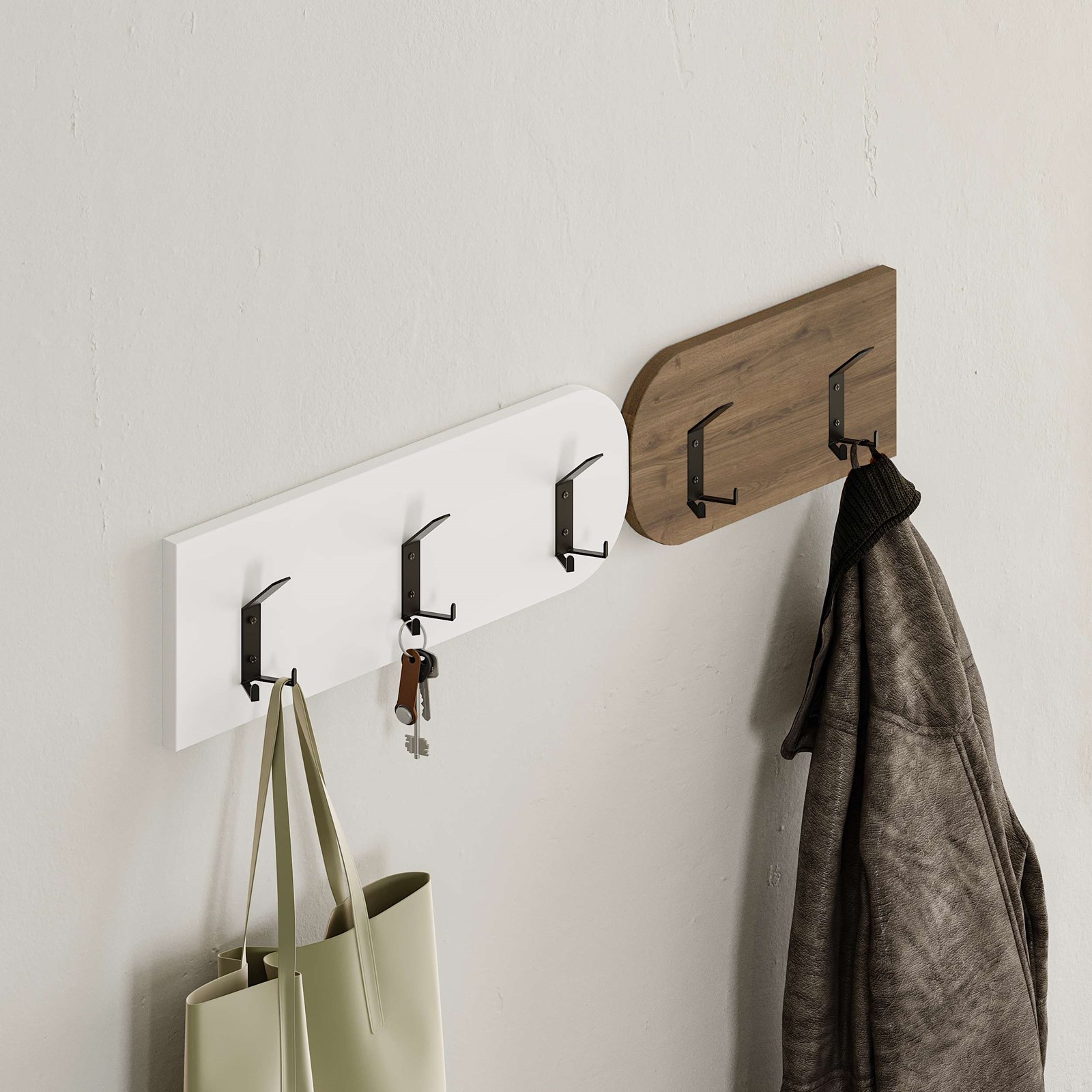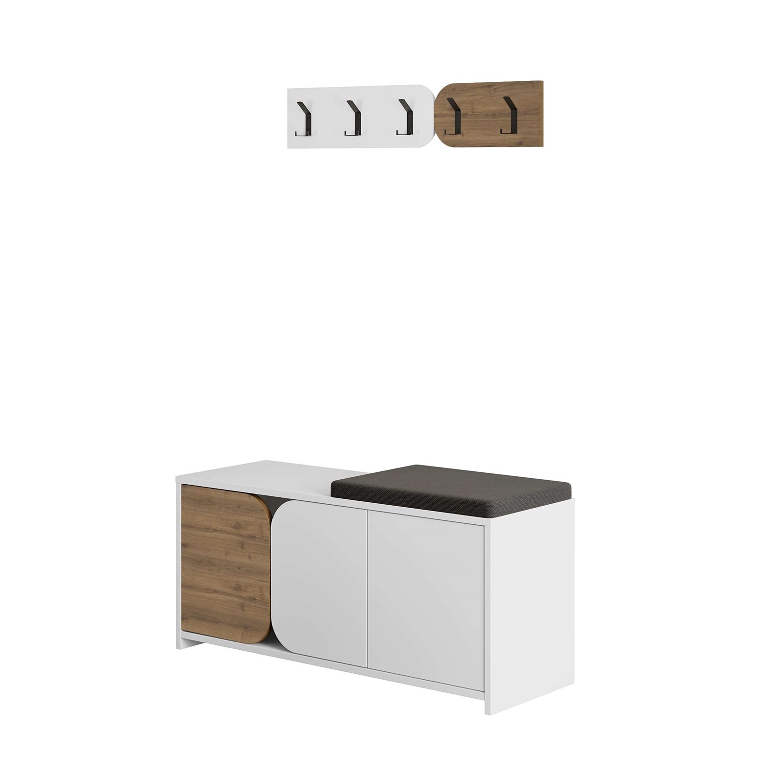 Pesë grepat elegantë metalikë të zinj – të montueshëm veçmas – ofrojnë hapësirë shtesë për varjen e palltove, çantave apo çelësave.