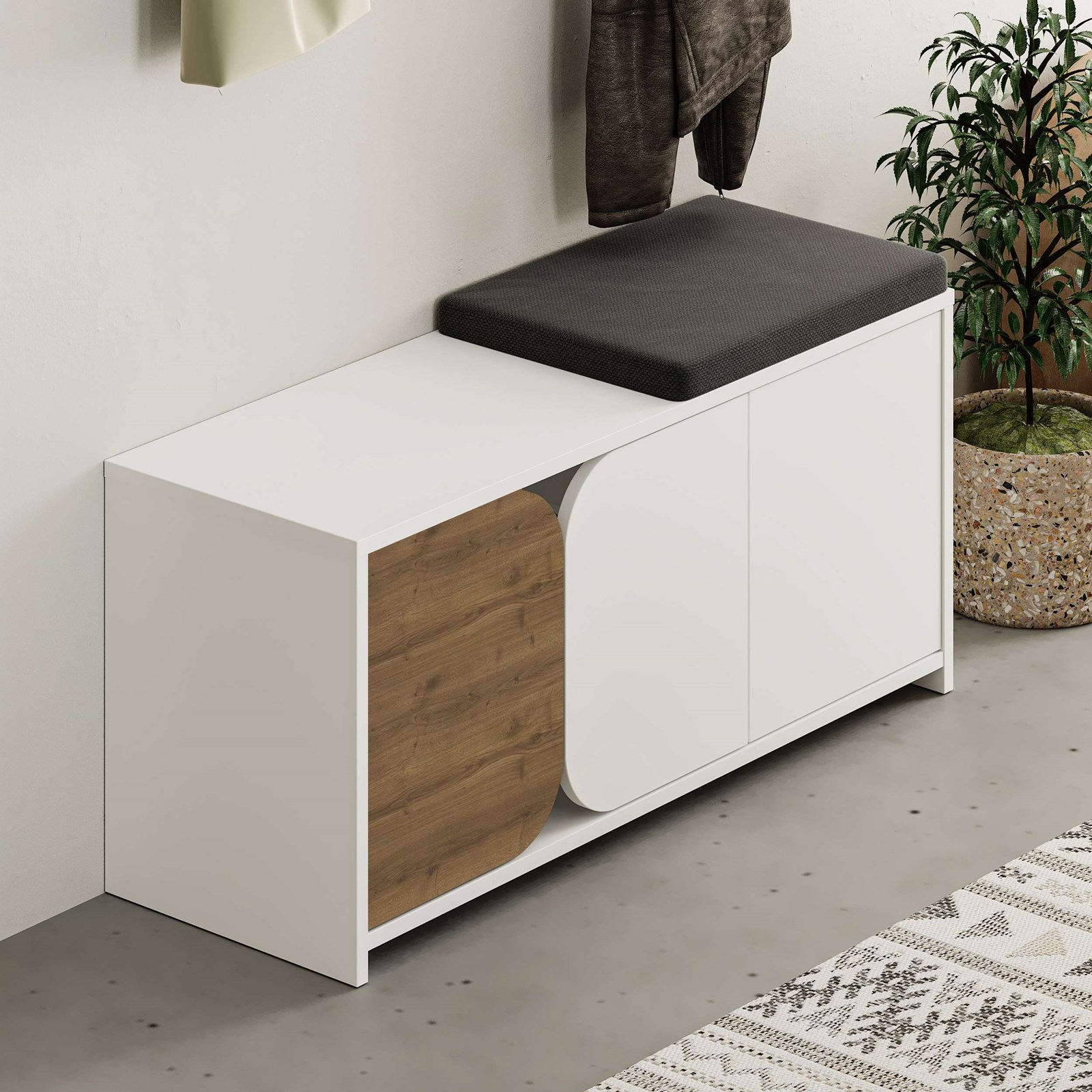 Me përmasa 52 x 104.9 x 37 cm dhe peshë 26.21 kg, dollapi ofron hapësirë të bollshme ruajtjeje pa e mbingarkuar ambientin tuaj. Një stol i butë prej pëlhure shton rehati dhe komoditet – ideal për rutinën tuaj të përditshme kur vishni ose hiqni këpucët.