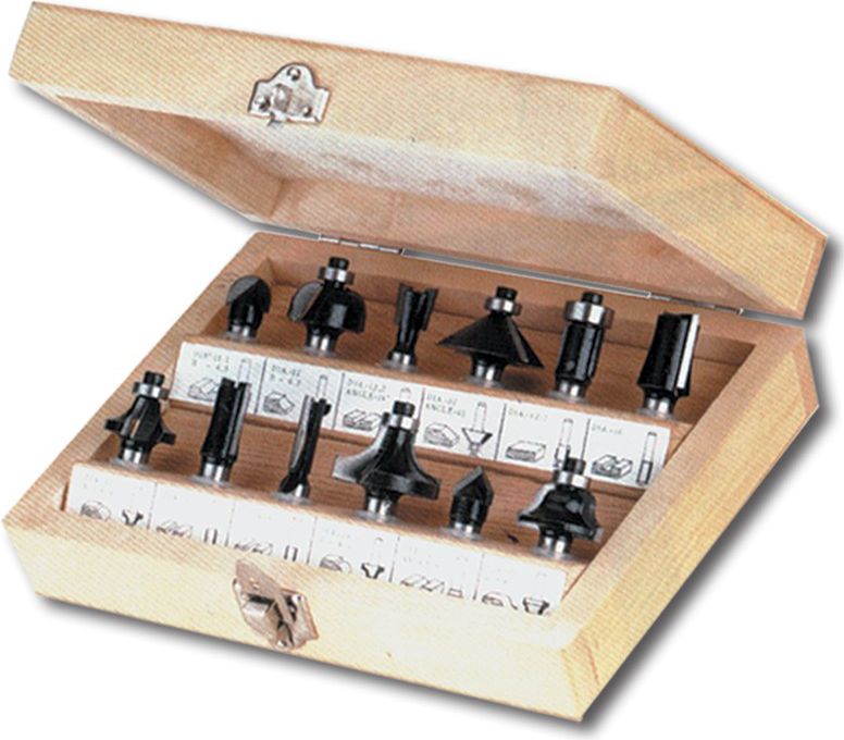12 copë prerëse në formë për dru, me karabit. Prerëset kanë një bosht 8 mm. Tehet janë bërë nga karbide të çimentuar. Këto janë prerëse të dizajnuara për përpunimin e drurit të fortë dhe të butë, kompensatë, chipboard, etj.