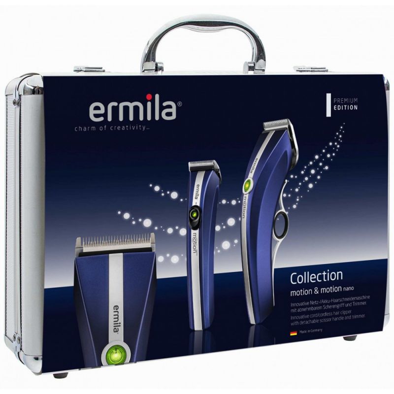 Ky set përfshin një makinë prerëse flokësh profesionale me formë ergonomike dhe funksionim të kombinuar, si dhe një trymer preciz premium me bateri. Të dy pajisjet janë të pajisura me motorë të fuqishëm rrotullues me deri në 5600 rpm, me zhurmë dhe dridhje të ulët. Gërshërët prej çeliku inox të serisë Star Blade II zëvendësohen lehtësisht me sistemin Quick Change. Makina Ermila Moser Motion ka bateri litium-jon me kapacitet të lartë që punon deri në 90 minuta pa ndërprerje dhe karikohet plotësisht në 45 minuta. Karikuesi është universal edhe për trymerin. Butoni i ndezjes ka indikator ngjyrash për nivelin e baterisë (jeshil, portokalli, i kuq). Pesha e makinës është vetëm 270 g, çka e bën të rehatshme për përdorim të gjatë pa lodhje dore. Trymeri Ermila Motion Nano punon me bateri NiMH 1700 mAh dhe rrjet elektrik, me autonomi deri në 100 minuta dhe kohë karikimi 120 minuta. Ka gjithashtu indikator LED për nivelin e baterisë. Trupi është ergonomik dhe modern, ndërsa pesha e lehtë prej 130 g lehtëson përdorimin e vazhdueshëm. Gërshëra janë të punuara me teknologji precize për prerje të sigurt edhe për lëkurë të ndjeshme. Përmbajtja e setit: makina prerëse flokësh Ermila Moser Motion, mbështjellës për makinën 3, 6, 9, 12, 18, 25 mm, trymer Ermila Motion Nano, mbështjellës i rregullueshëm për trymer 3-6 mm, kapëse e lëvizshme “unazë”, adapter rrjeti, Type 6000, bazë karikimi, furçë pastrimi për gërshërë, vaj për lubrifikimin e mekanizmit të gërshërëve dhe valixhe alumini për ruajtje dhe transport të sigurt.
