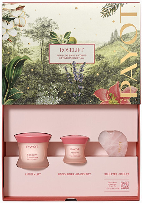 Seti përfshin kremin Roselift Daily Lifting Cream, i cili mbështet prodhimin e kolagjenit, zbut dhe tonifikon lëkurën falë peptideve të kolagjenit, ekstraktit të trëndafilit të Damaskut, pro-kolagjenit dhe acidit hialuronik. Kremi ofron një efekt lifting, redukton rrudhat dhe ka aromë delikate me nota trëndafili, frutash dhe druri. Aplikimi bëhet në fytyrë dhe qafë me masazh të butë. Gjithashtu përfshihet Roselift Lifting Eye Cream, një krem i lehtë për zonën e syve që forcon konturin, redukton ënjtjet dhe rrathët e zinj, duke ofruar një efekt ndriçues dhe të freskët. Aplikoni butësisht në zonën e syve.Në set është përfshirë edhe pllaka e masazhit Guasha Visage nga kuarci i trëndafilit, e cila përmirëson dukshmërinë e lëkurës, zbut rrudhat, redukton ënjtjet dhe unifikon tonin e saj. Përdoret me krem, vaj ose serum, duke masazhuar fytyrën dhe trupin për të përmirësuar qarkullimin e gjakut dhe për të rigjallëruar lëkurën.