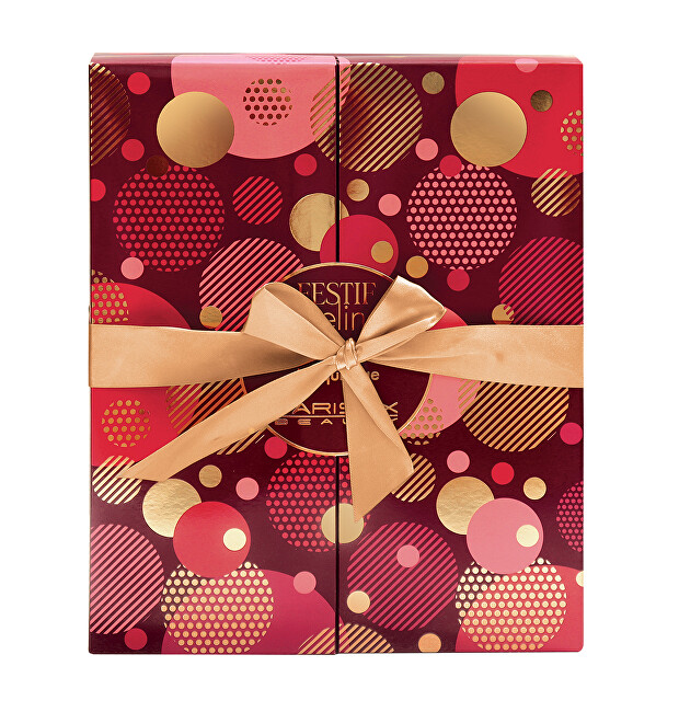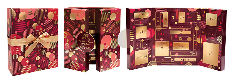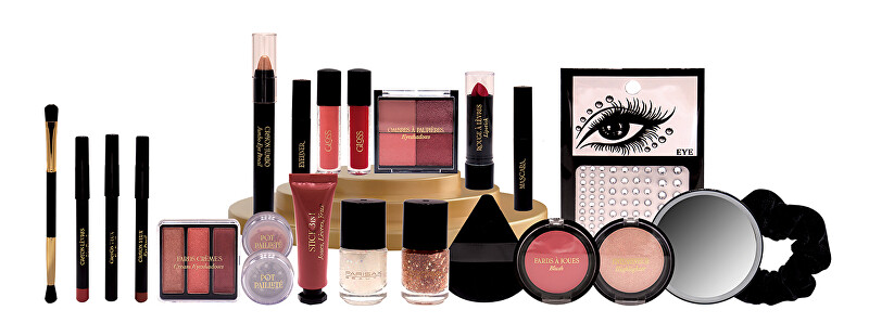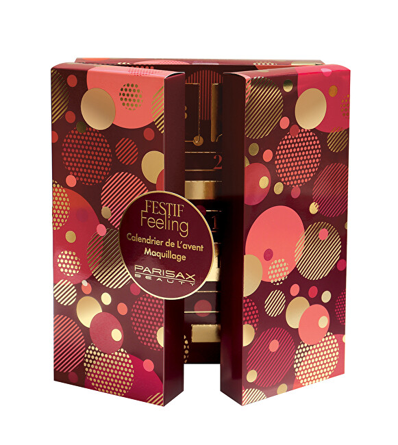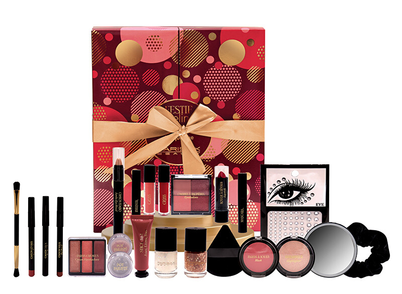 Kalendari përfshin një paletë hijesh për sy, një paletë me hije kremi, një skuqës, një ndriçues, dy nuanca shkëlqyese, një buzëkuq, dy llakë thonjsh, një hije të lëngshme për sy, dy shkëlqyes buzësh, një laps jumbo për sy, një eyeliner të lëngshëm, një maskarë, një laps 3-në-1, një laps të zi dhe një laps kafe për sy, një laps për buzë, një sfungjer grimi, një furçë me dy anë, një pasqyrë, një llastik flokësh dhe një set me gurë vetëngjitës për një pamje të plotë dhe të shkëlqyer.