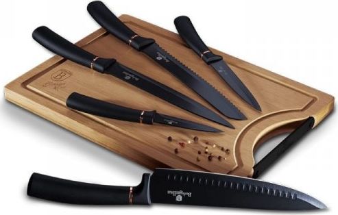 Seti i tillë nga Berlinger Haus kombinon elegancën dhe funksionalitetin duke paraqitur tehe nga çeliku inoks; të veshura me një shtresë jo-ngjitëse me cilësi të lartë, që lehtëson prerjen dhe mirëmbajtjen. Çdo thikë ka një dorezë ergonomike të mbuluar me një shtresë silikoni të qëndrueshme, që siguron kapje të sigurt dhe të rehatshme në çdo kusht kuzhine. Seti përfshin thikën e kuzhinierit, thikën e bukës, thikën për filetim, thikën universale, thikën për qërim dhe një dërrasë prerëse prej bambuje. Të gjitha janë të vendosura në një kuti kartoni magnetike me futje shkumë për ruajtje të sigurt. Të dizajnuara për t’u përputhur me serinë e enëve të gatimit BLACK ROSE / ROSE GOLD, këto thika ofrojnë forcë dhe qëndrueshmëri pa mbajtur aromat e ushqimit apo lënë njolla. Shtresa jo-ngjitëse është miqësore me mjedisin dhe nuk përmban substanca të dëmshme si PFOA, plumb apo kadmium, duke e bërë setin të sigurt për përdorim të përditshëm.