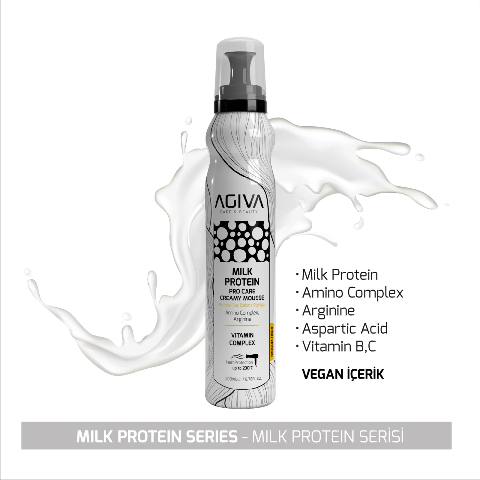 Mbajtje mesatare - Kompleks vitaminash. Mbrojtje nga nxehtësia deri në 230°C. Milk Protein Pro Care Hair Mousse i jep flokëve formën që dëshironi duke ofruar një pamje të lehtë dhe natyrale dhe duke siguruar kujdes të thellë me kompleks vitaminash. Përdorimi: Apliko në flokë të pastër dhe të lagur. Pas larjes së flokëve, thani butësisht me peshqir për t’i mbajtur të lagur. Shkundni mirë mousse-in para përdorimit për të siguruar që të dalë në mënyrë të njëtrajtshme. Shtrydhni një sasi sa një arrë gjahu në dorë. Shpërndani mousse-in në mënyrë të barabartë në flokë duke përdorur gishtat. Pas aplikimit, stiloni flokët sipas dëshirës.