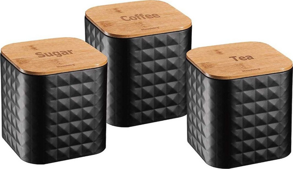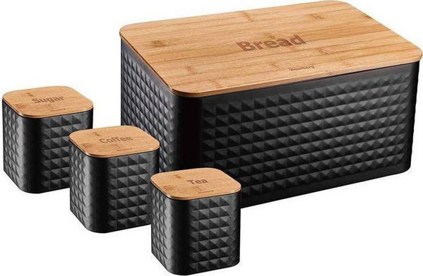 Set me 3 kontejnerë me kapak bambuje për ruajtjen e produkteve të lirshme. Sheqer, Kafe, Çaj të stampuar në kopertina. Kapakë të pajisur me guarnicione silikoni për të siguruar hermetikën e produkteve të ruajtura. Trupi inox i lyer me ngjyrë të zezë. Mbulesa e sipërme prej druri bambuje. Mund të përdoret si dërrasë prerëse. Projektuar për ruajtjen e të gjitha llojeve të bukës. Dizajn tërheqës, modern. E përbërë nga materiale ekologjike. Përmasat e kutisë së bukës: 23 x 35 x 18,5 cm. Përmasat e kontejnerëve: 11.5 x 11.5 x 12.3 cm.