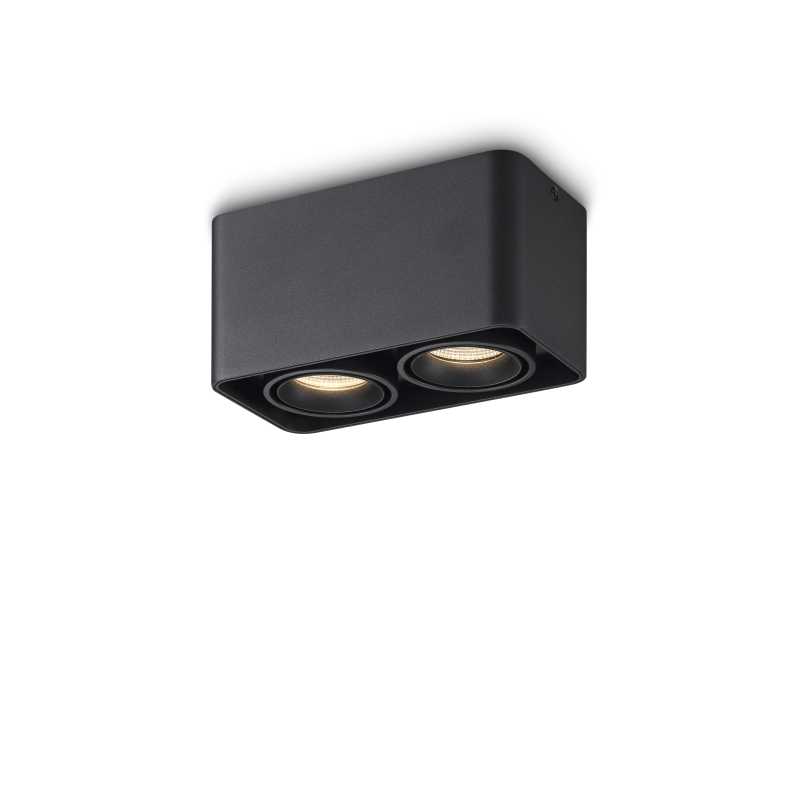Spot tavanor për ambientet e jashtme, me dy mbajtëse GU10, i ndërtuar nga alumin i fortë dhe i rezistueshëm ndaj kushteve atmosferike. Dizajn modern në ngjyrë të zezë, ideal për ndriçim në hyrje, ballkone, nën streha dhe ambiente të jashtme të mbrojtura.