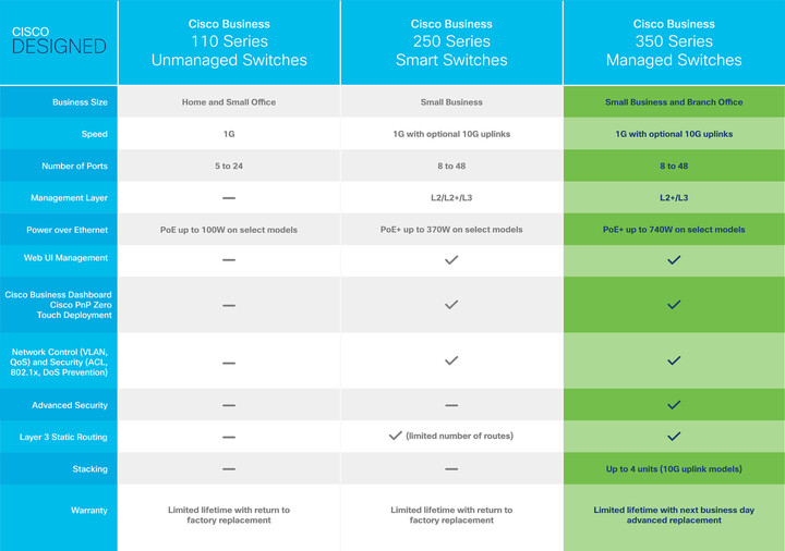 Switch i menaxhueshëm thekson sigurinë e lartë të mjedisit të rrjetit dhe administrimin e tij të lehtë, duke përfshirë rezistencën ndaj sulmeve. Ai ofron mbështetje për IPv6, VLAN, ndërrimin e shtresave 2, QoS, STP dhe shumë veçori të tjera. Menaxhimi i mundshëm nëpërmjet Cisco Business Dashboard; UI në pajisje, CLI, SNMP. Ndërfaqja: 20x porte 10/100/1000 PoE , 4x porte 100M/1G/2.5G PoE (4 me mbështetje 60W PoE), 4x porte 10G (2x 10G bakër/SFP combo 2x SFP ), buxheti i energjisë PoE 375W. Switch është i përshtatshëm për raft.