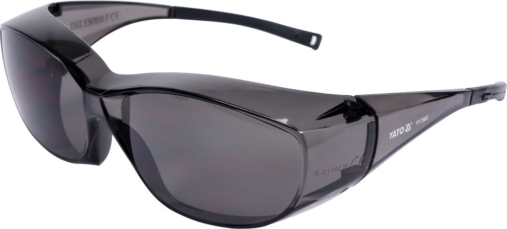 Syze sigurie të lehta, me lente dhe kornizë të bërë nga polikarbonat i fortë, i tejdukshëm me ngjyrë gri. Këto syze janë të dizajnuara për punë të ndryshme teknike si mërmëritje, të gdhendura, ose punime të tjera ku nevojitet mbrojtje nga grimcat e ndezura. Kërcyli i tyre ka majat prej gome të butë të zezë që parandalojnë rrëshqitjen aksidentale të syzeve gjatë përdorimit. Dizajni “fit-over” lejon që të vishen mbi syzet me recetë, duke ofruar kështu mbrojtje shtesë pa pasur nevojë t’i hiqni syzet e zakonshme. Syzet i përkasin kategorisë së mbrojtjes II dhe kanë rezistencë mekanike, duke përballuar goditje nga grimca me peshë 86 gram dhe shpejtësi prej 45 m/s. Materiali i polikarbonatit siguron që syzet të jenë të forta dhe të qëndrueshme, ndërsa ngjyra gri e lenteve ndihmon në reduktimin e shkëlqimit.