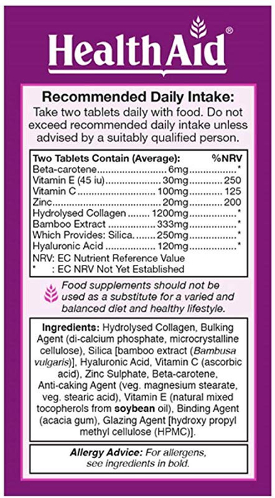 Collagen Complex nga HealthAid, është një formulë e shkëlqyeshme e bukurisë e cila rinon, rigjallëron dhe hidraton thellësisht lëkurën. E përzgjedhur shkathtësisht me 7 përbërës të cilët njihen për vetitë e tyre përtritëse për lëkurën; Collagen Complex ndihmon në rigjallërimin dhe në mbrojtjen kundër radikaleve të lira, për një lëkurë të shëndetshme dhe të freskët me shkëlqim. Kolagjeni i hidrolizuar është forma e cila më së miri absorbohet në organizëm dhe së bashku me Acidin Hilauronik këto tableta e ruajnë elasticitetin dhe strukturën e fytyrës si dhe mirëmbajnë shëndetin e nyjeve.